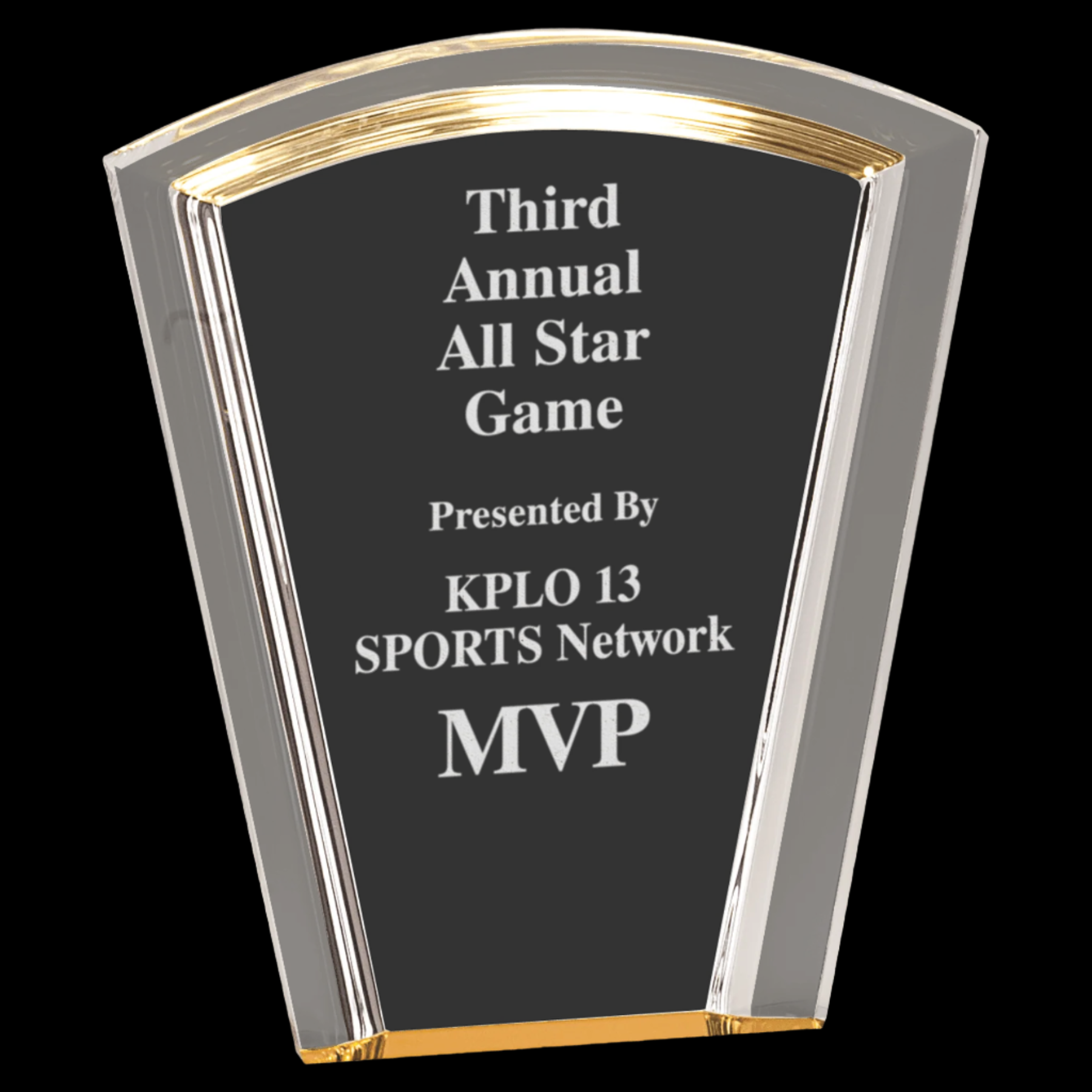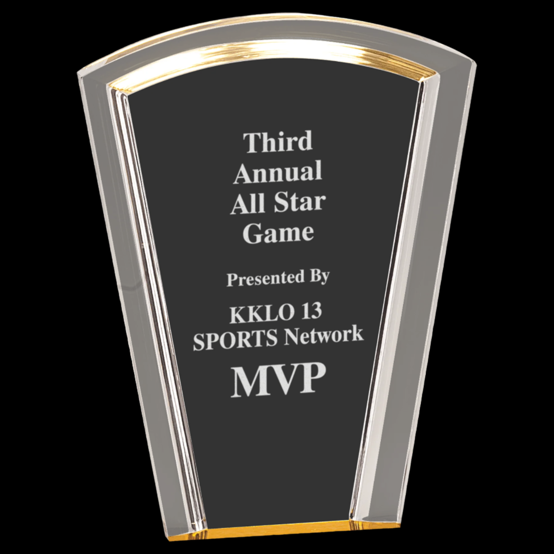Crafted from 1" thick acrylic, the Gold Fan Halo Acrylic combines durability with elegant design. Available in multiple styles and colors, this self-standing piece offers versatile display options, making it ideal for both professional and decorative settings. Its robust construction ensures stability while adding a sophisticated touch to any environment.