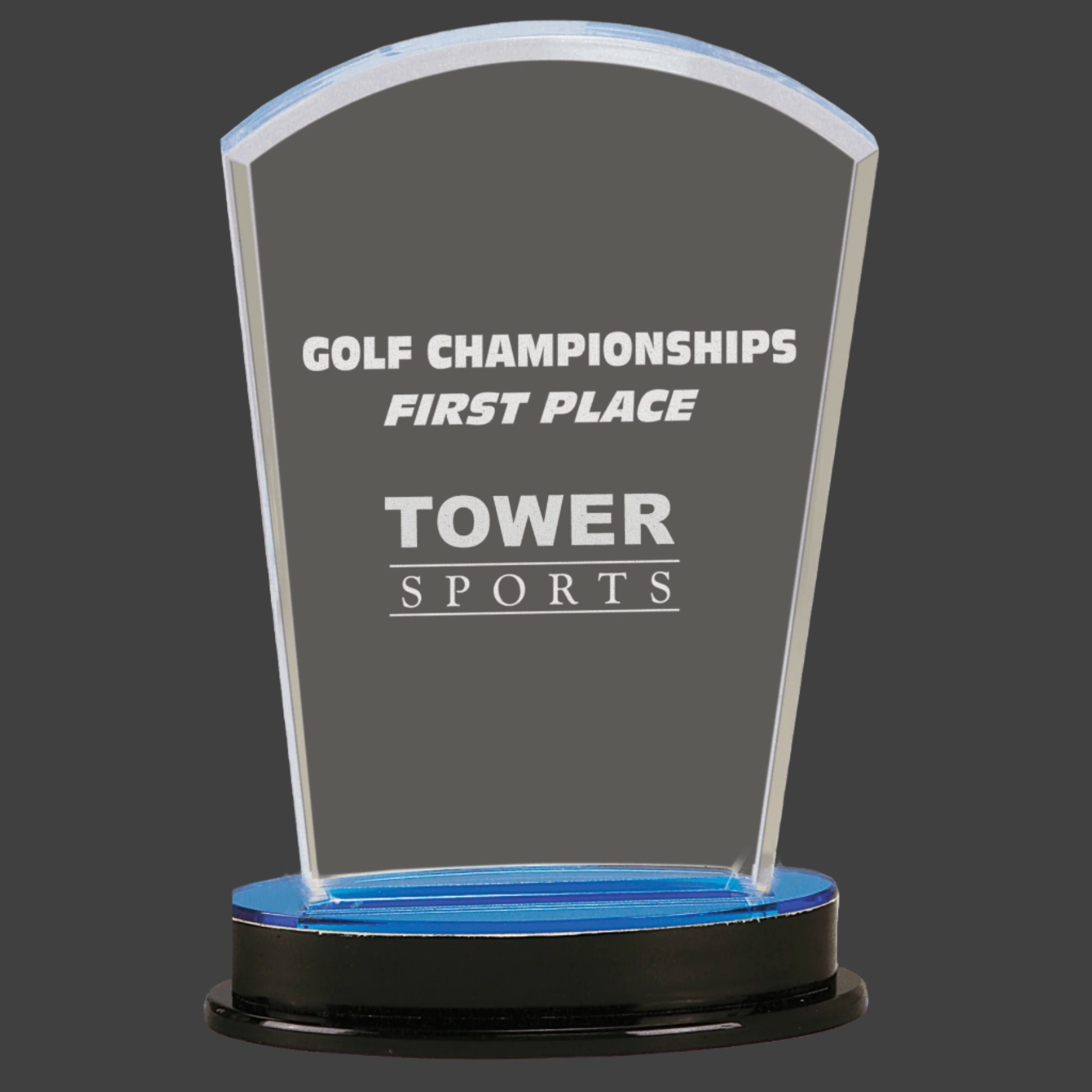 Arch Impress Acrylics Come with a Colored Mirror Base. They are .75" Thick. Height Measurement Includes Base. Available in Multiple Colors and Sizes.