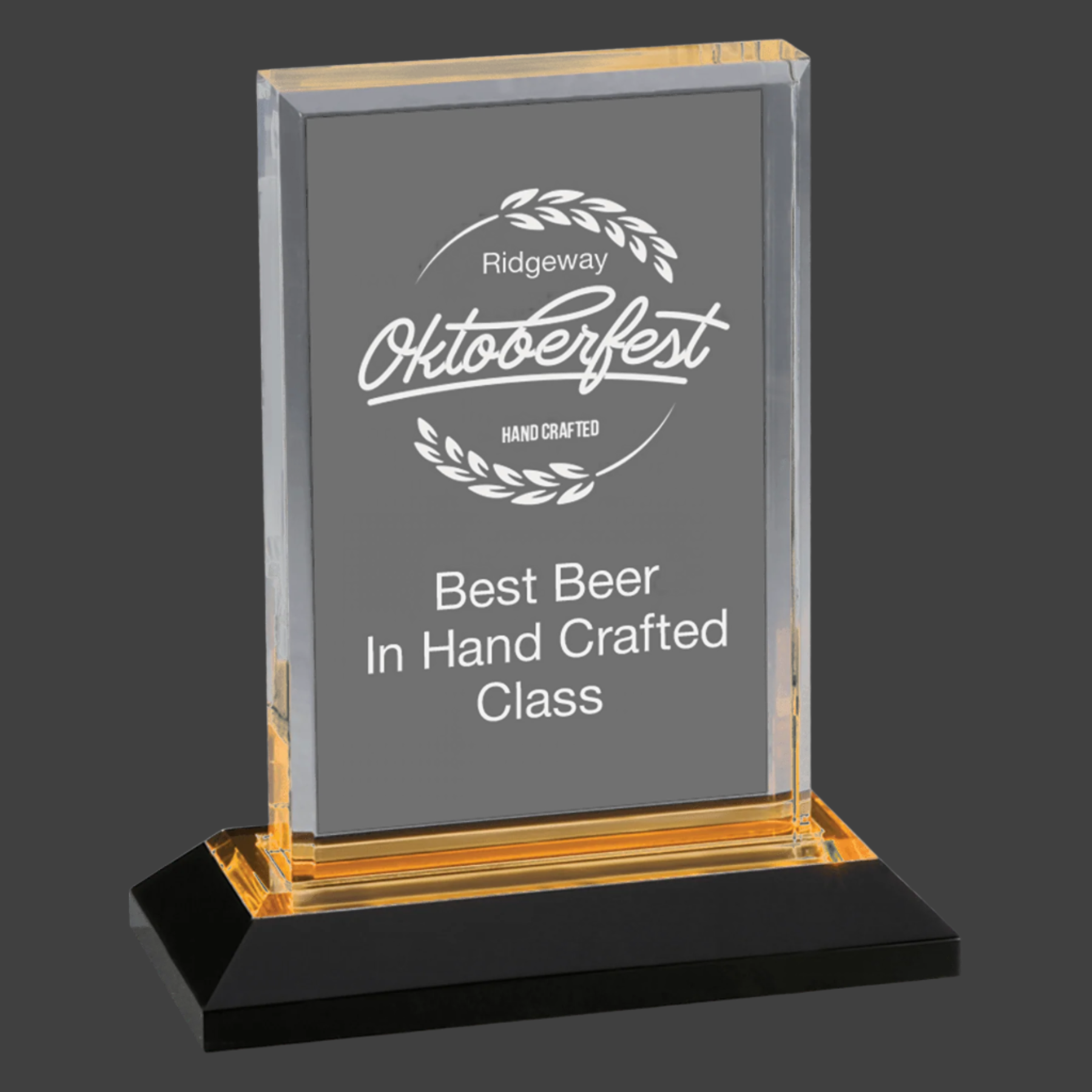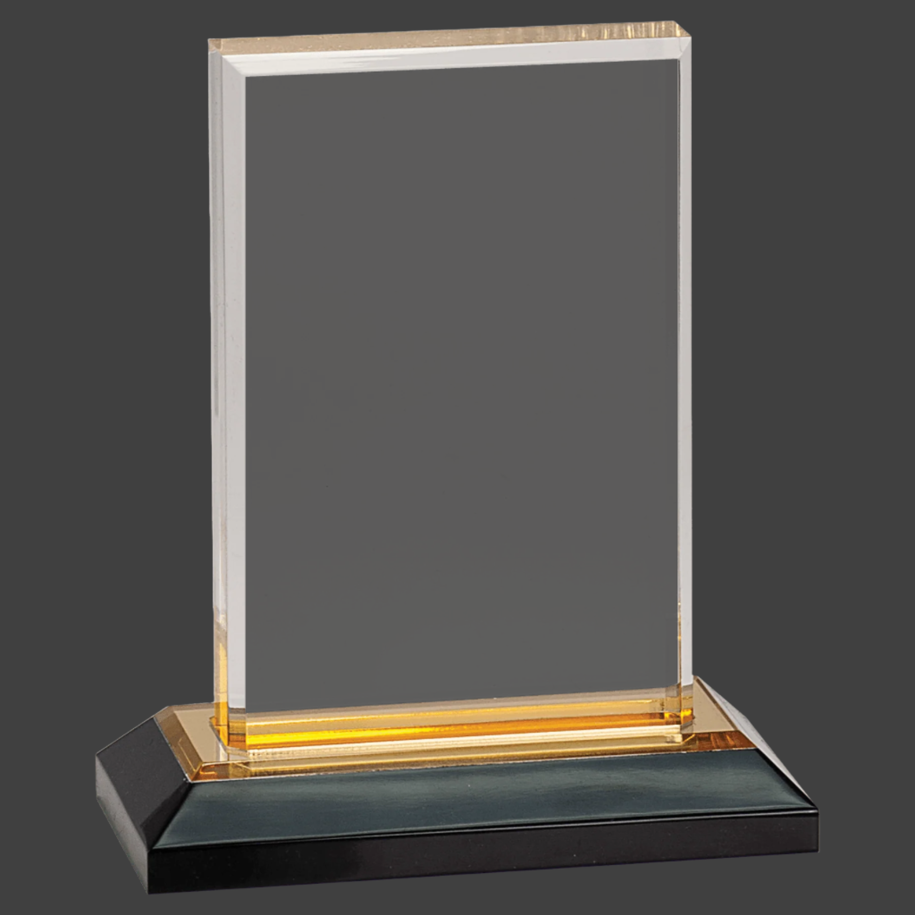 Gold Beveled Impress Acrylics feature a 1" thick design with a colored mirror base that enhances their visual impact. The total height includes the base, providing a substantial and elegant presence. Available in various sizes and colors, these acrylics offer versatile options for professional displays and presentations.