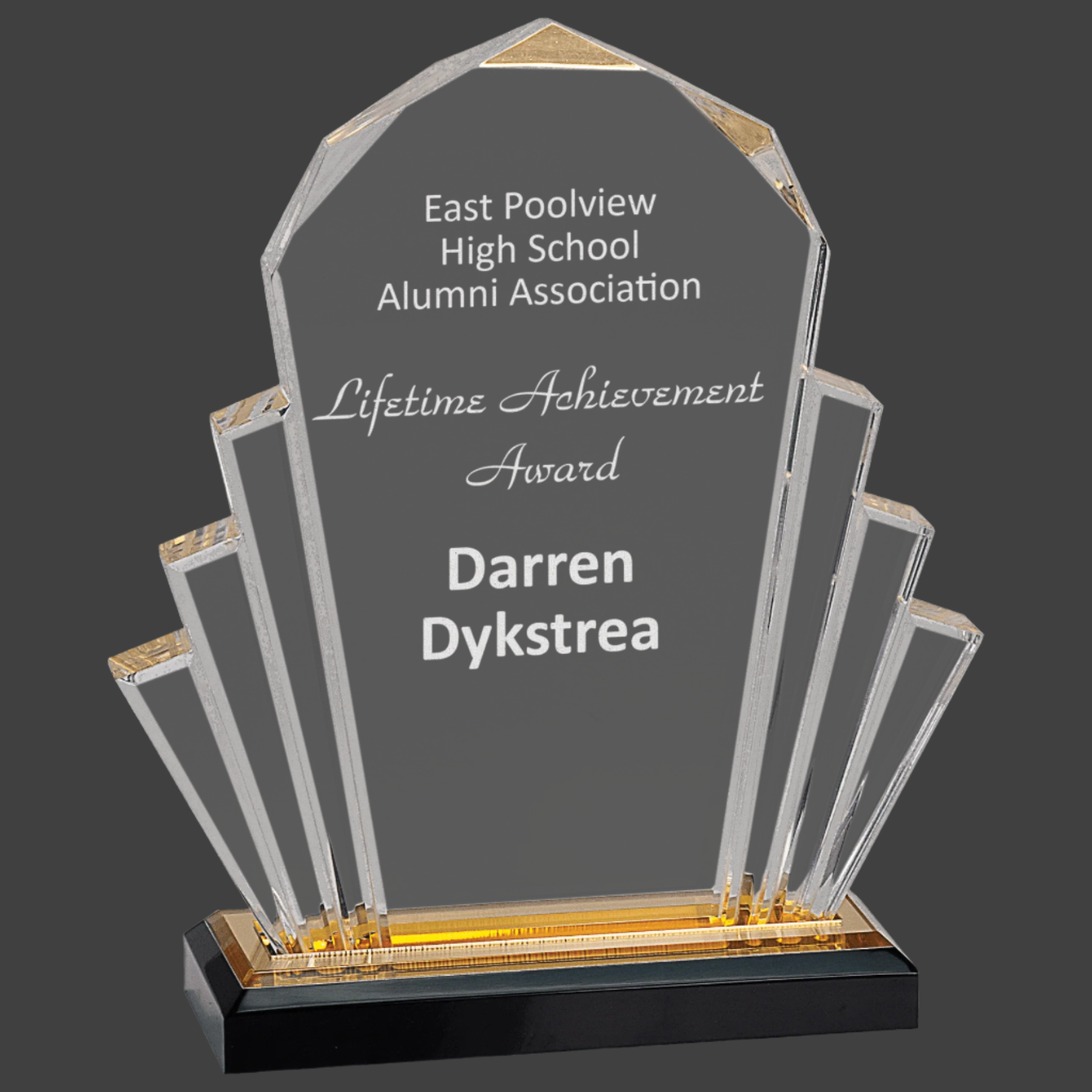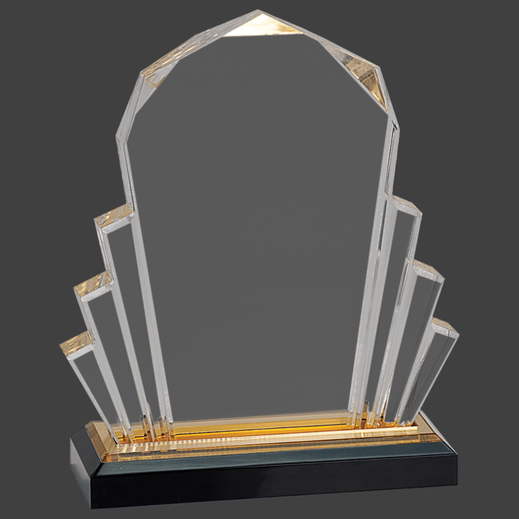 Gold Faceted Impress Acrylics feature a striking colored mirror base and a durable 1" thickness, with height measurements that include the base for accurate sizing. Available in various sizes and colors, these acrylics offer versatile options for professional displays and presentations. Their faceted design enhances visual appeal while maintaining sturdy construction.