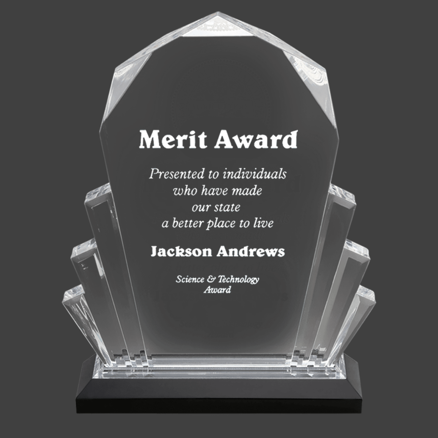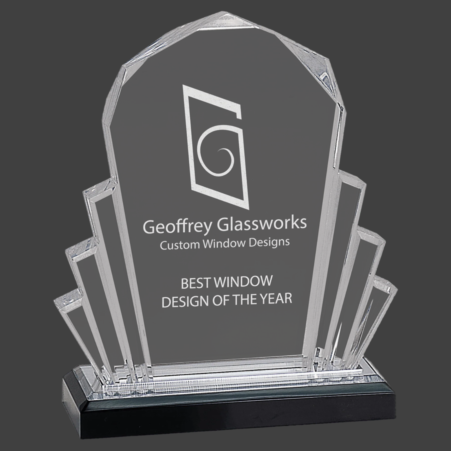 Silver Faceted Impress Acrylics feature a striking colored mirror base and a durable 1" thickness. The total height includes the base, ensuring a substantial presence. Available in various sizes and colors, these acrylics offer versatile options for professional displays or decorative applications.