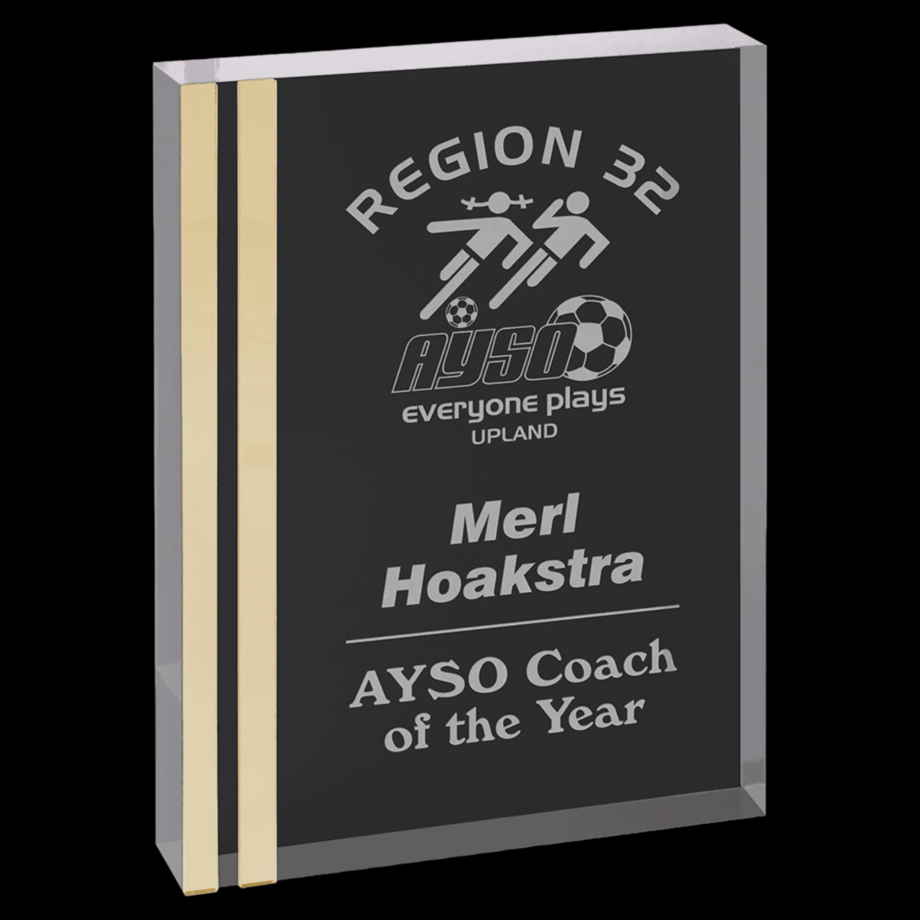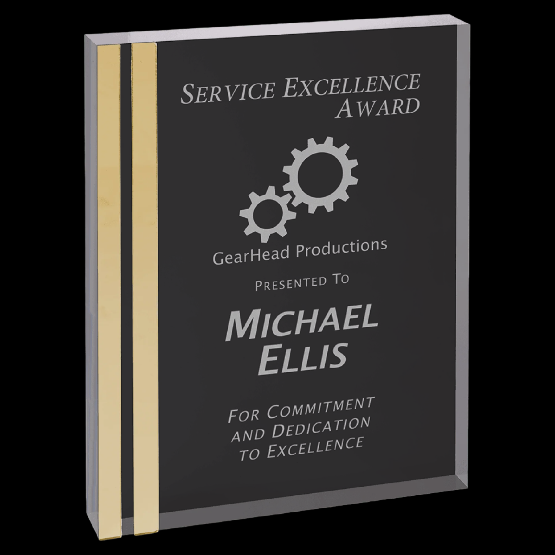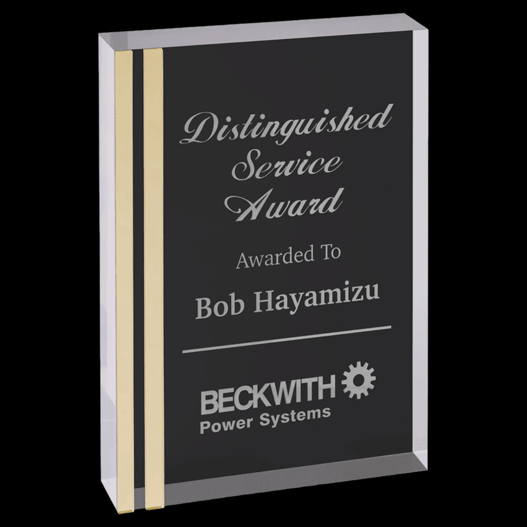 This Rectangle Acrylic with Gold Edge features a clear personalization area framed by a vibrant gold border, adding a sophisticated accent to any display. At 1" thick, it is self-standing, providing sturdy support without additional fixtures. Ideal for professional settings, it combines durability with elegant design to showcase your custom content effectively.