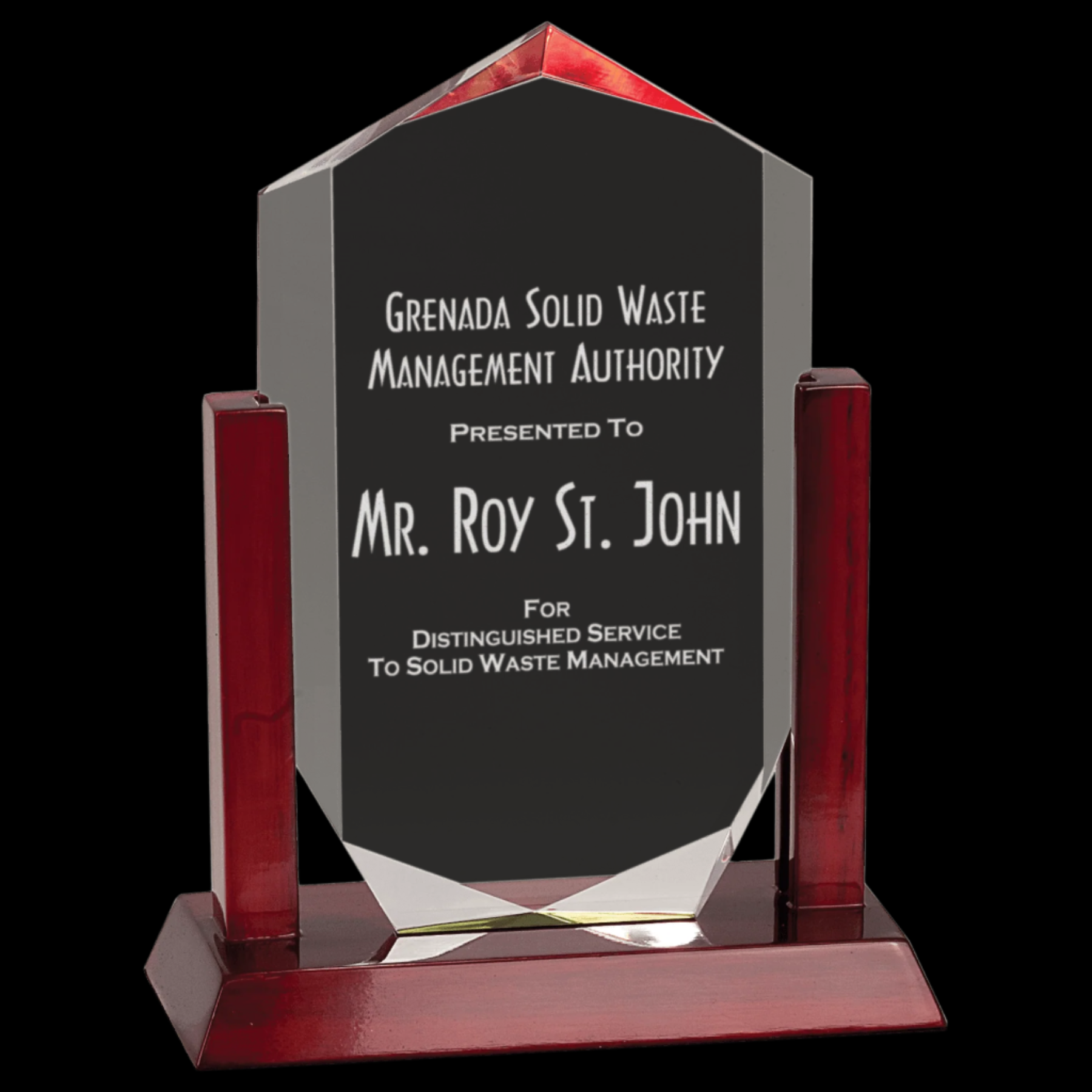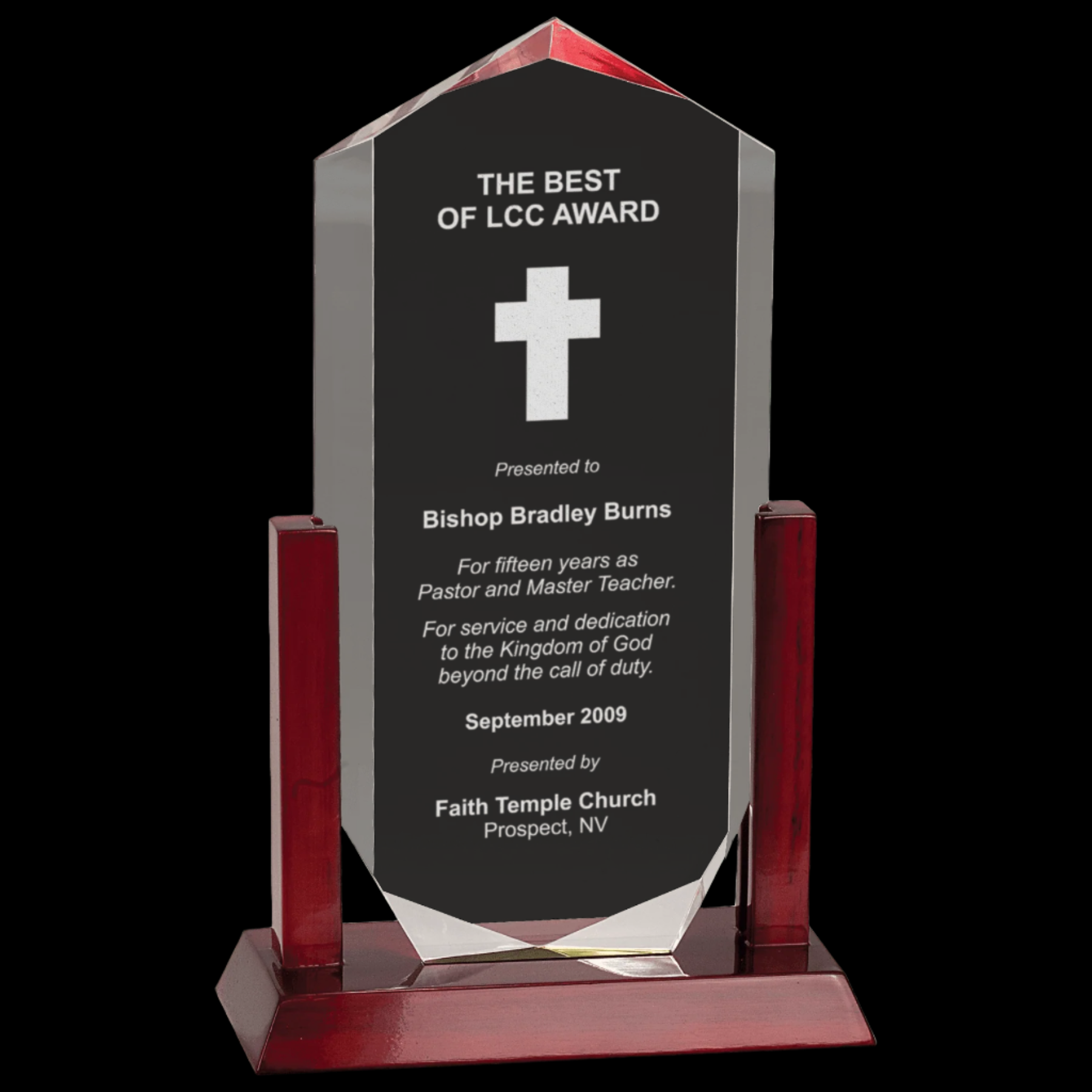 Clear Royal Crown Acrylics showcase a sophisticated rosewood piano finish base and frame, combining elegance with durability. Measuring 0.75" thick, these acrylics are available in three sizes to suit various display needs, offering both versatility and a premium aesthetic for professional presentations.