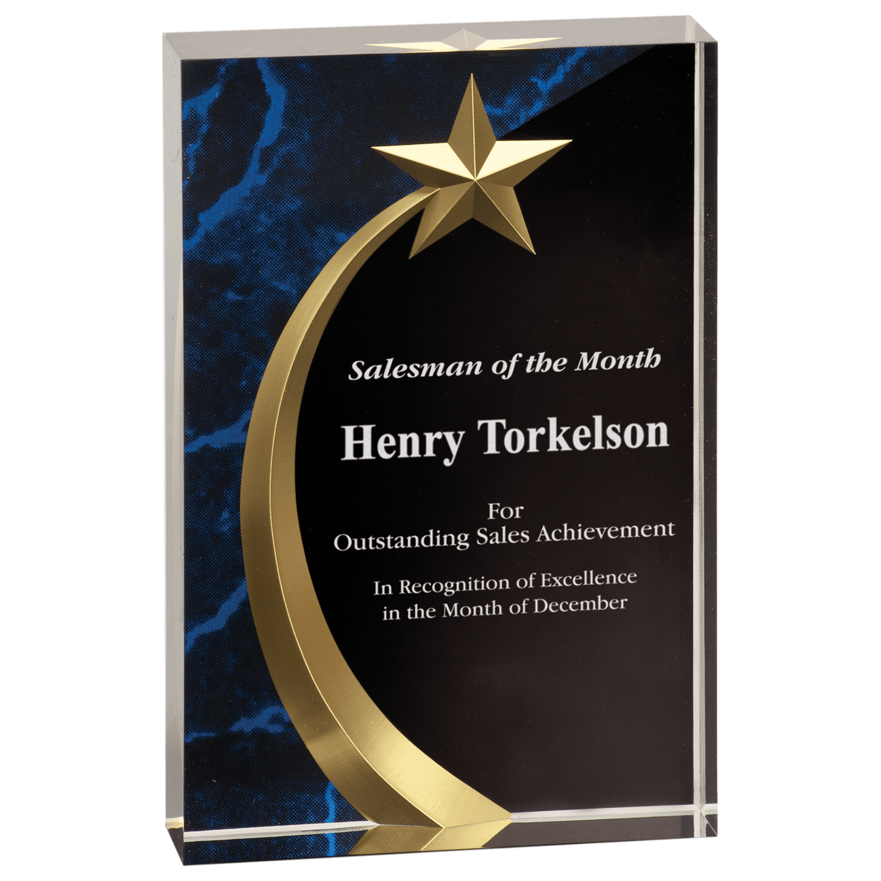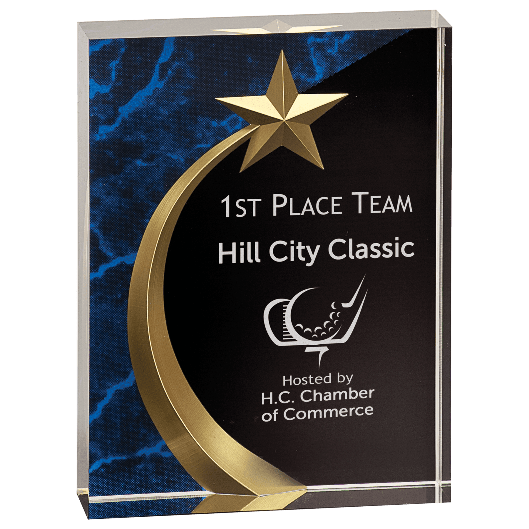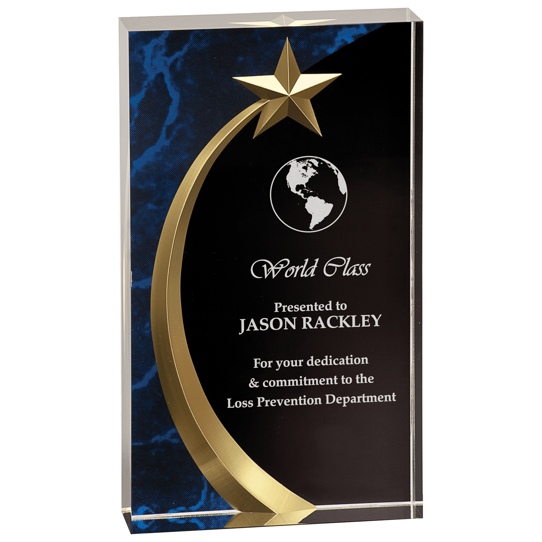 The Blue Marble Square Shooting Star Acrylic award features a sturdy 1.25" thick design that stands independently, making it an ideal choice for showcasing achievements with elegance and durability. Its solid construction ensures lasting display without the need for additional support.