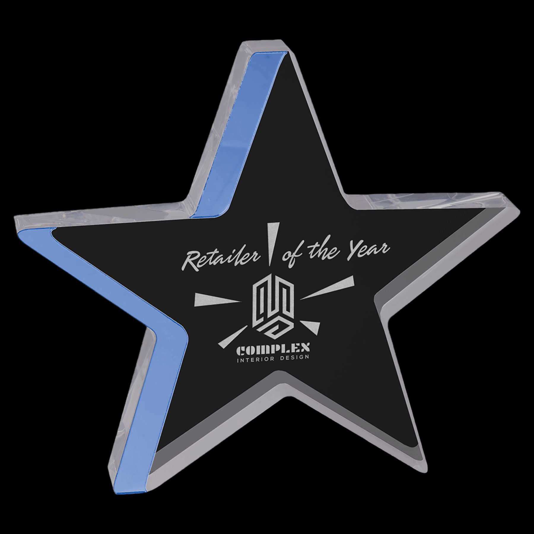 Color Edge Star Acrylic awards feature a striking blue edge and a sturdy 1-inch thickness, designed to stand independently without additional support. Their solid construction ensures durability and a professional appearance, making them ideal for recognizing achievements with a modern, elegant touch.