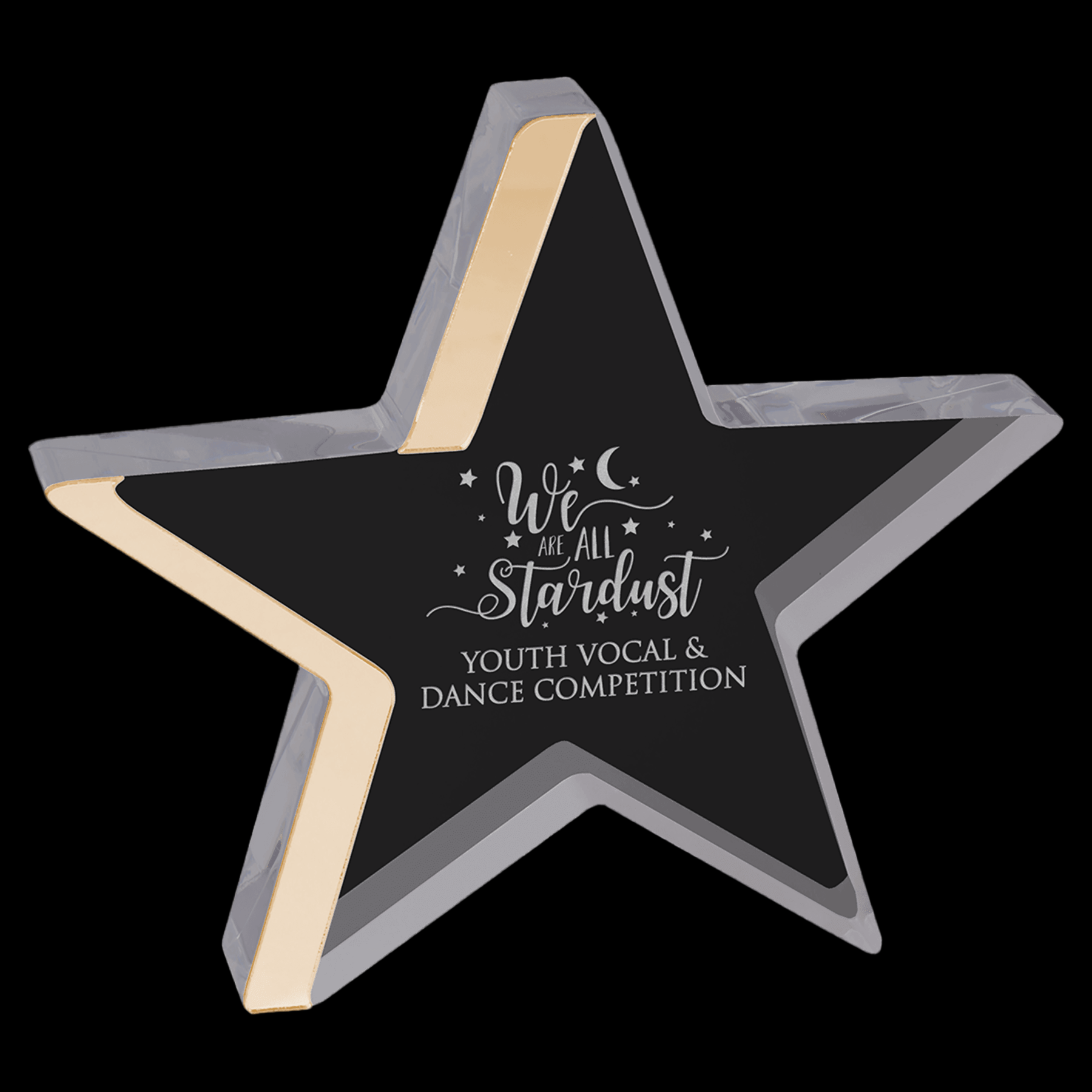 The Star Acrylic with Gold Edge award features a striking gold-colored edge and a sturdy 1-inch thickness, ensuring durability and a premium appearance. Designed to be self-standing, it offers an elegant display without the need for additional support, making it an excellent choice for recognizing achievements with style and professionalism.