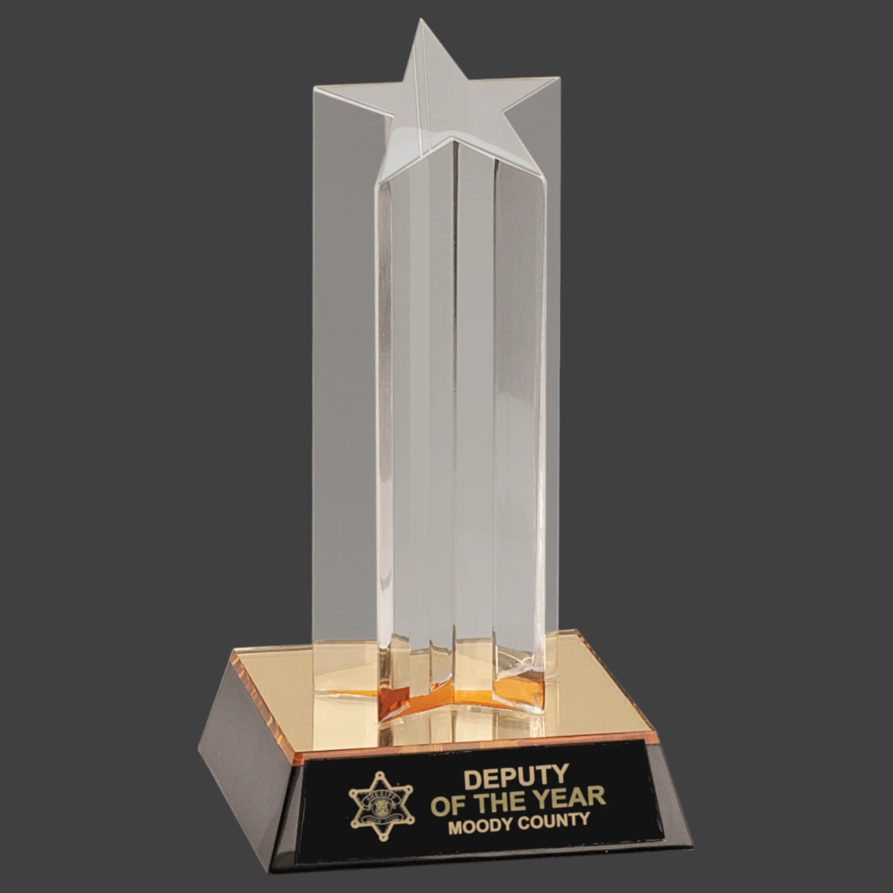 This Clear Single Star Column Acrylic award features a sleek design with a gold and black base, complemented by a black brass plate for personalized engraving. Its elegant construction makes it an ideal choice for recognizing outstanding achievements with a professional and distinguished presentation.