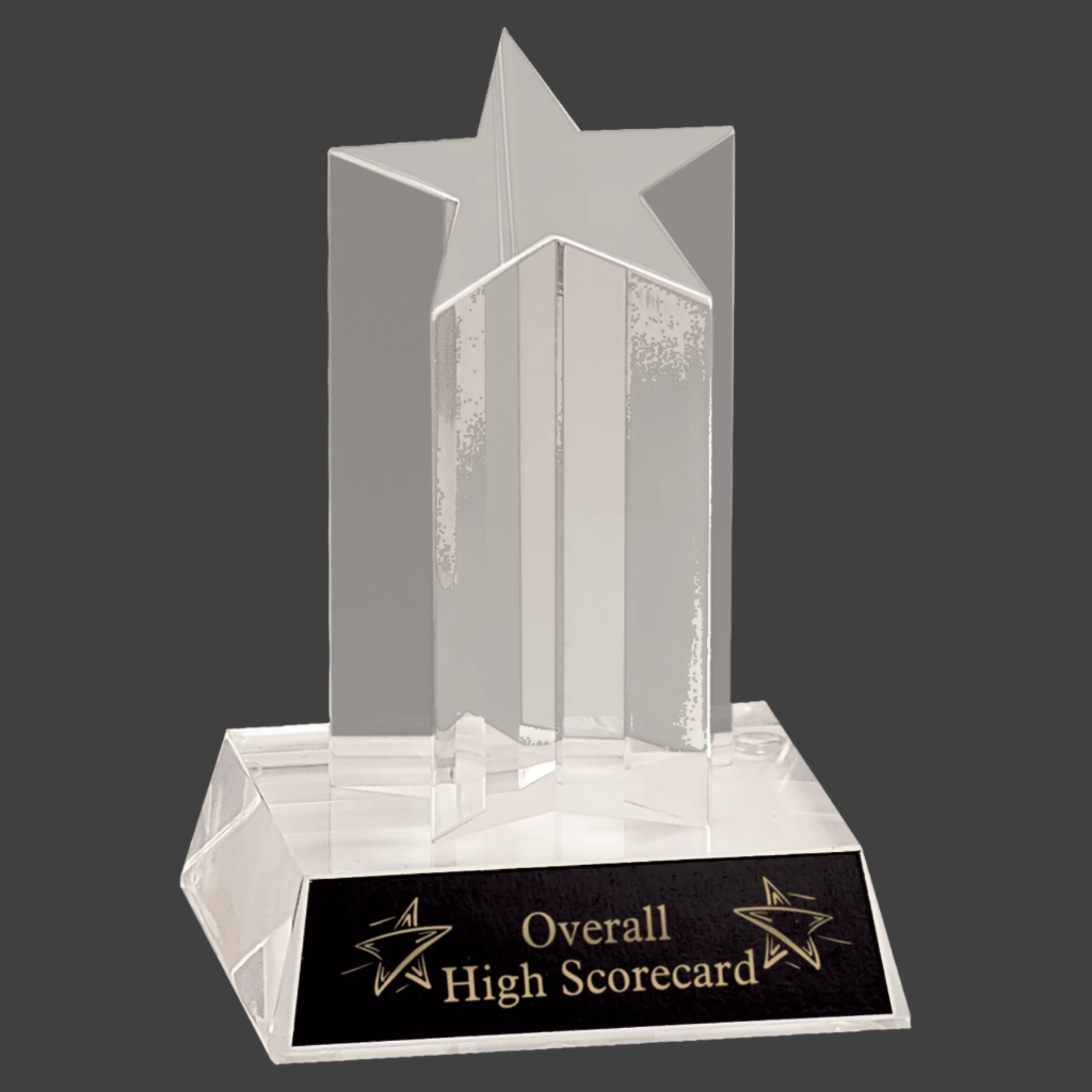 This Clear Single Star Column Acrylic award, standing 5 inches tall, features a sleek clear base and includes a black brass plate for personalized engraving. Its elegant design makes it an ideal choice for recognizing outstanding achievements with a professional and timeless presentation.