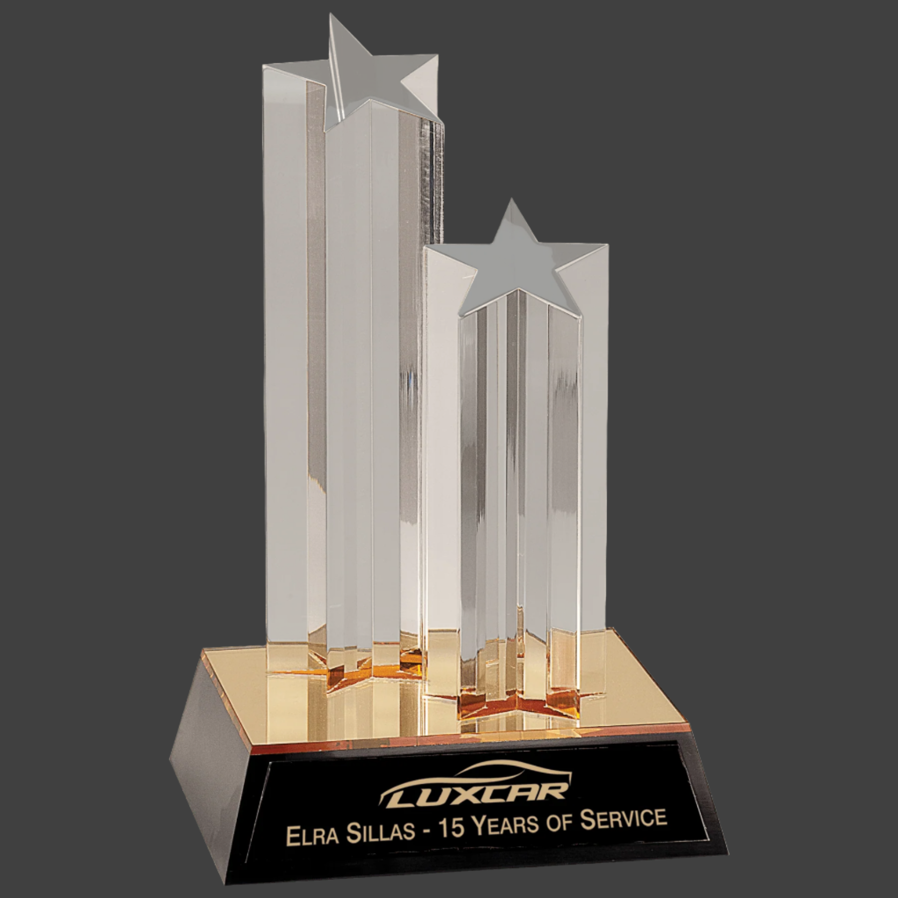 This Clear Double Star Column Acrylic award stands 9.5 inches tall and features a sleek gold and black base. It includes a durable black brass plate for personalized engraving, combining elegance with lasting quality—ideal for recognizing outstanding achievements with a professional touch.