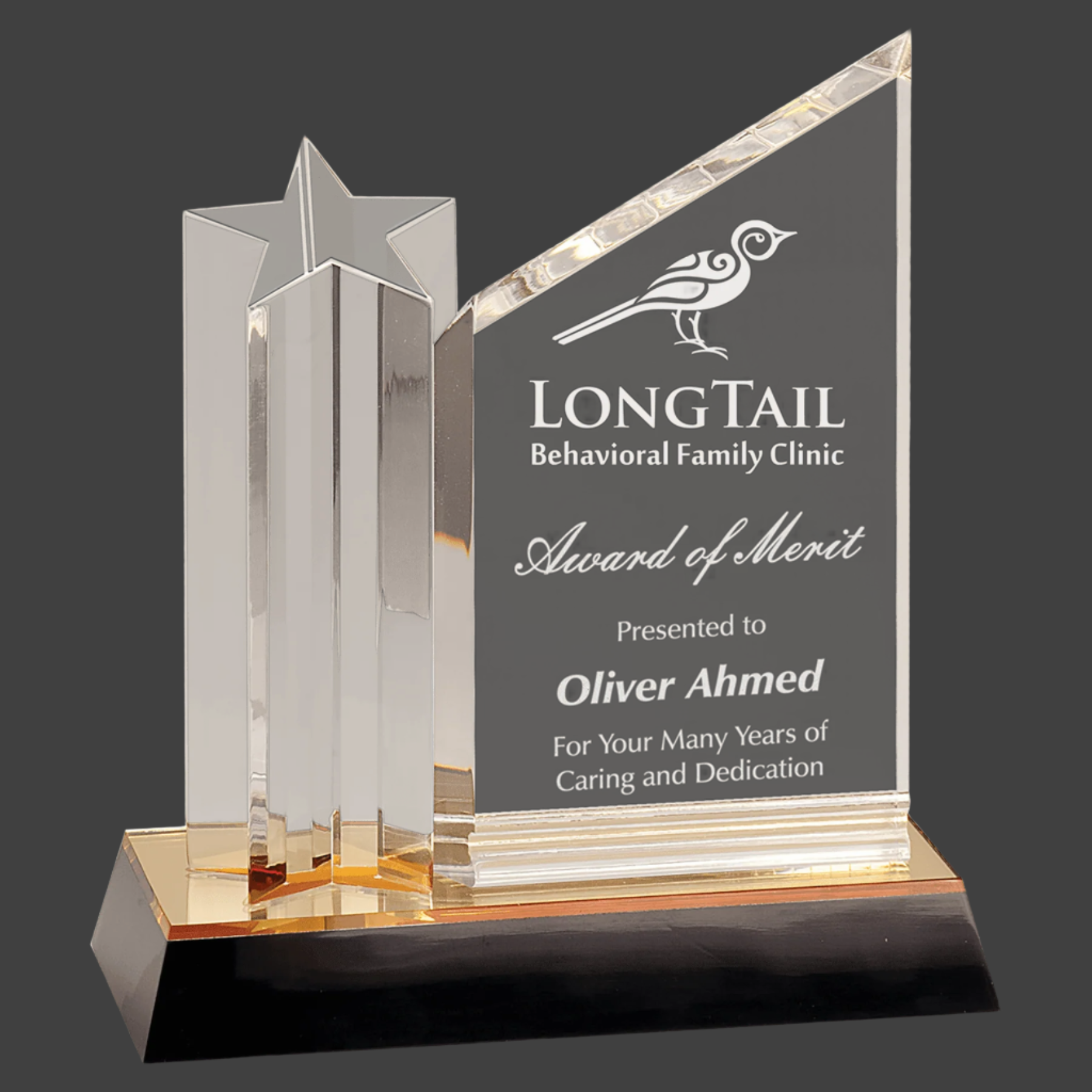 The Clear Star Column Acrylic trophy combines elegance with a striking design, featuring a clear star-shaped column that beautifully highlights the attached gold and black base. This award is perfect for recognizing achievements on any occasion, offering a sophisticated presentation that enhances the significance of the honor. Its clear plaque provides ample space for personalized engraving, making it a distinguished choice for professional and formal events.