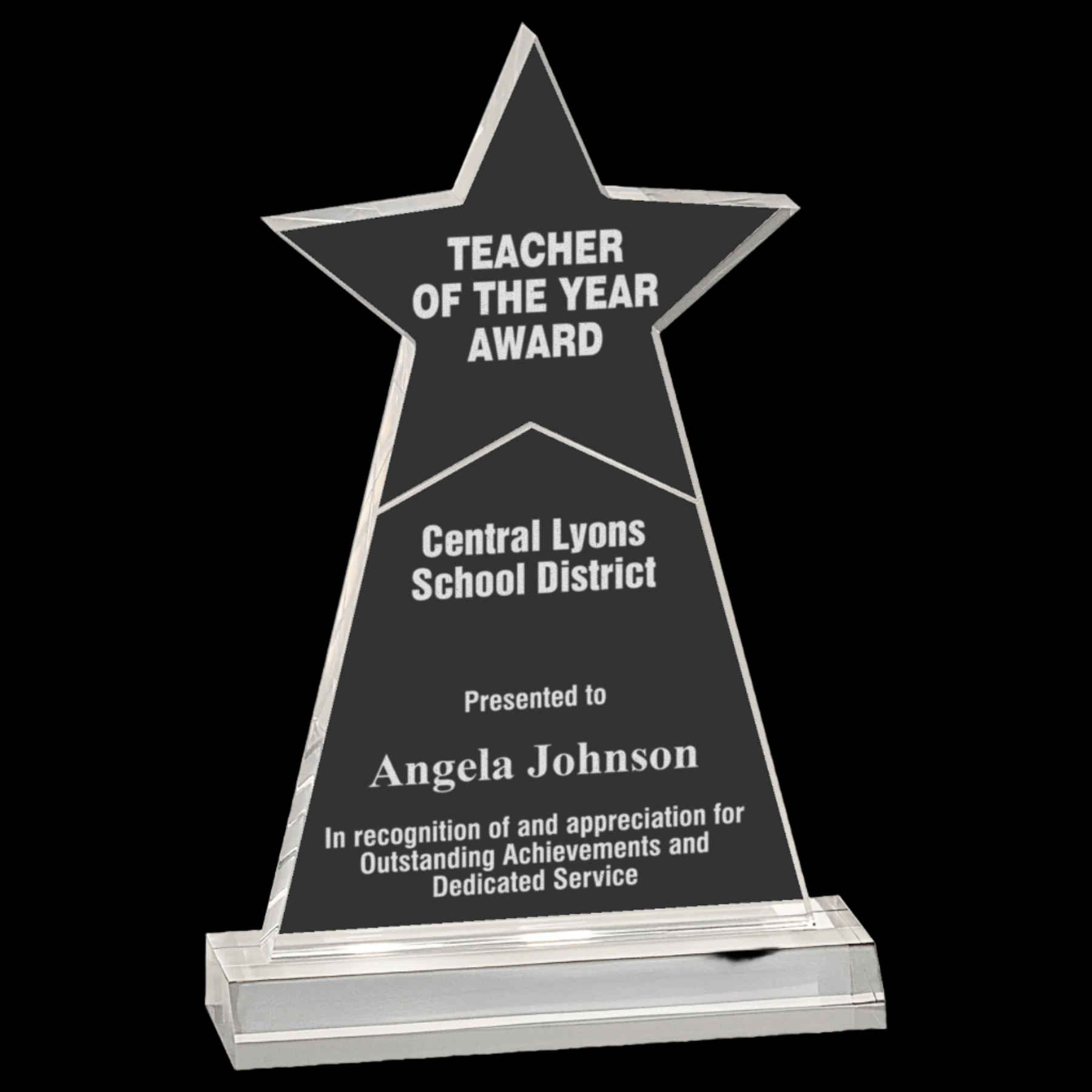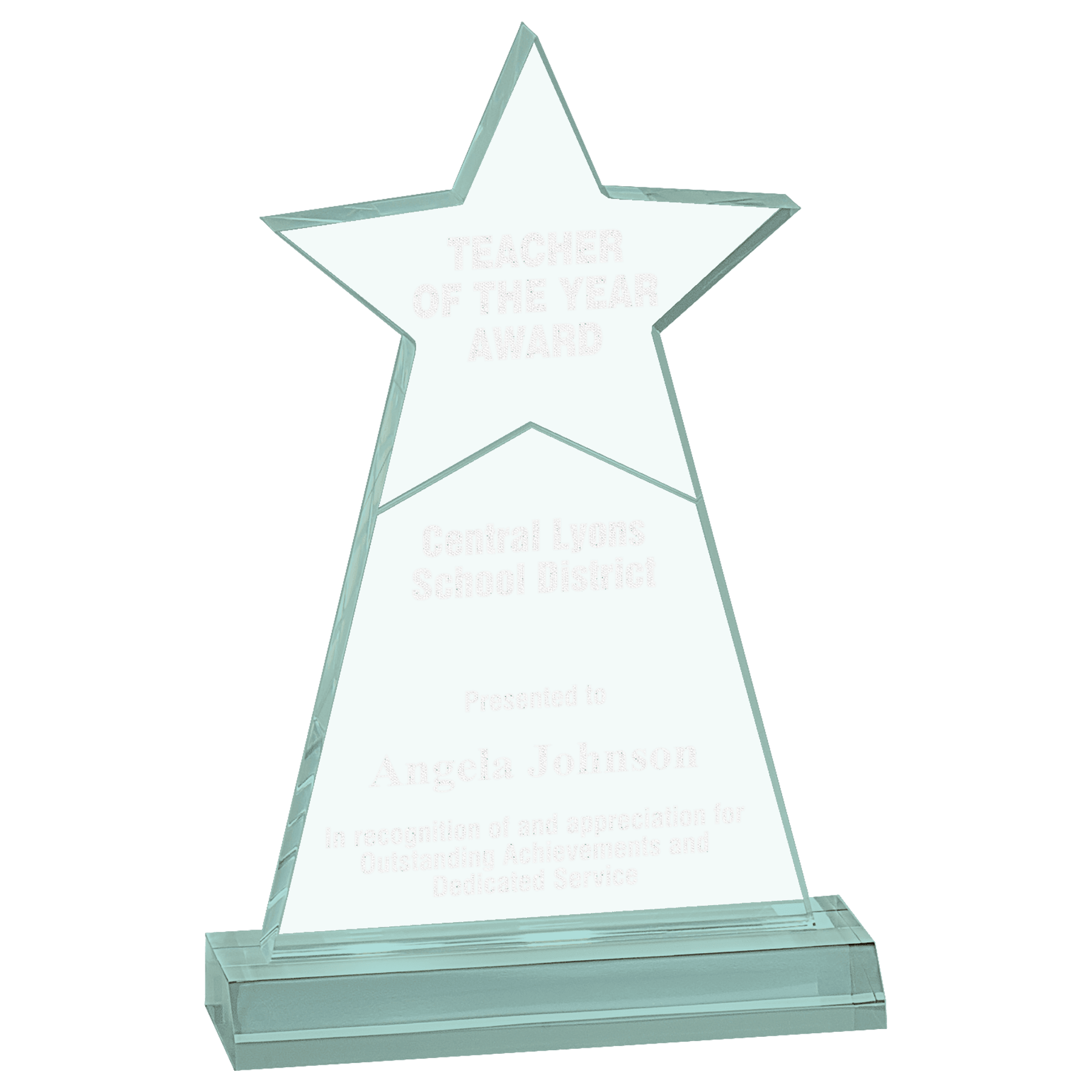 Star Obelisk Acrylic awards feature a sturdy 0.75" thick construction, ensuring durability and a premium feel. Each award includes a 5.75" base that provides stable support and an elegant presentation, making it ideal for recognizing achievements with a sleek, modern design.