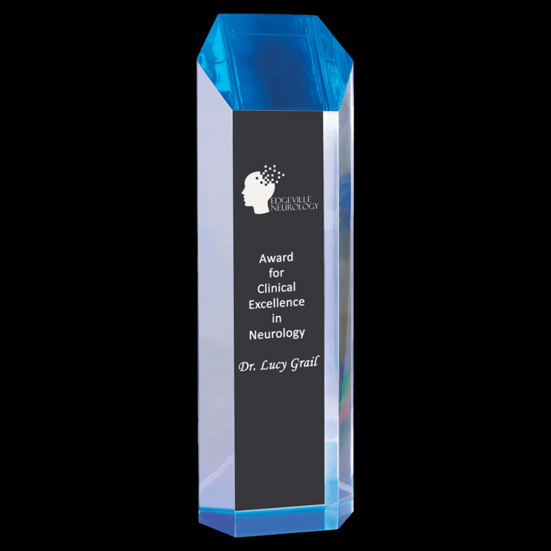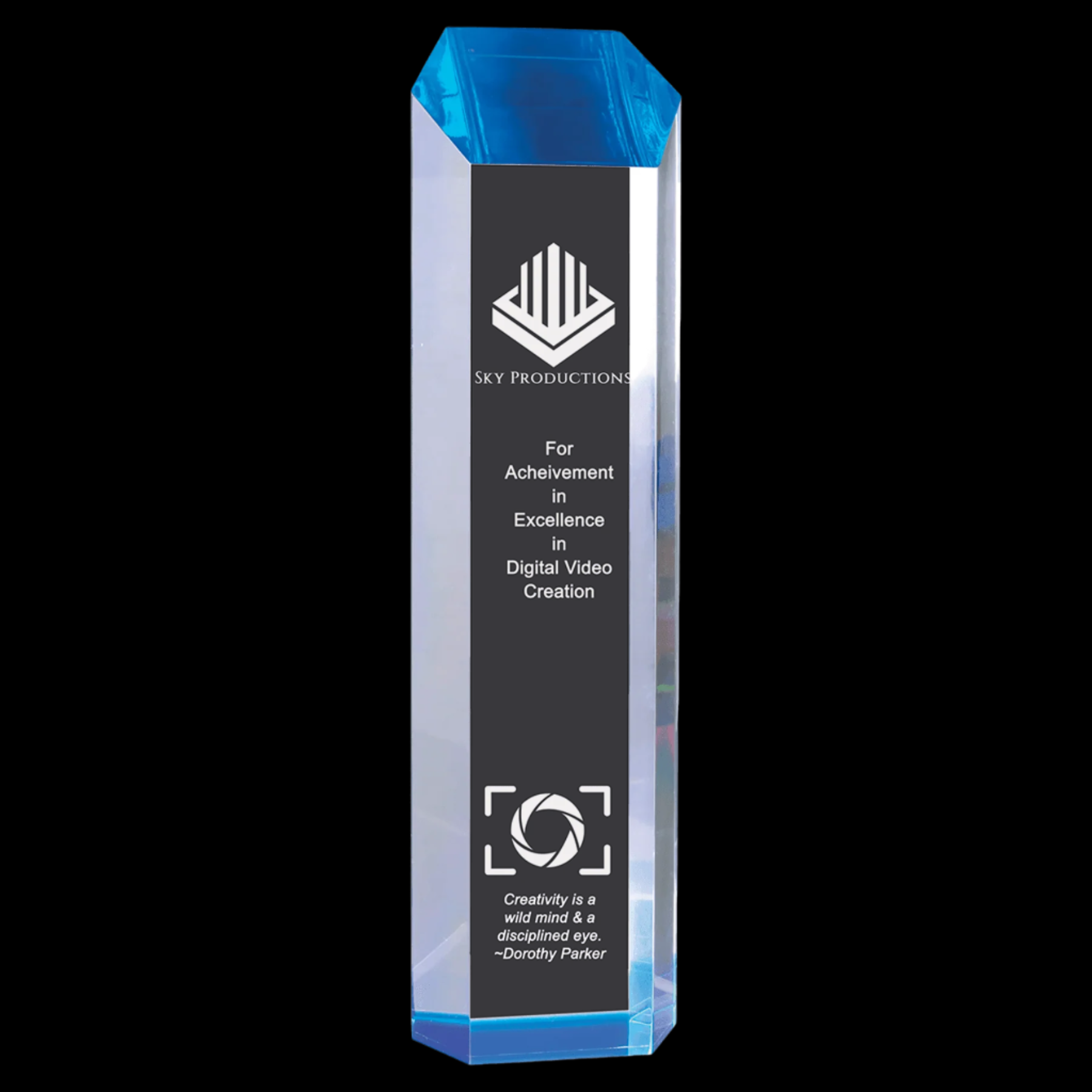 The Blue Tower Acrylic stands 2 inches tall and is designed to be self-supporting, offering a sturdy and reliable display solution. Its compact size makes it ideal for showcasing small items or organizing spaces with a professional touch. Crafted for durability, this acrylic tower combines functionality with a sleek, modern aesthetic.