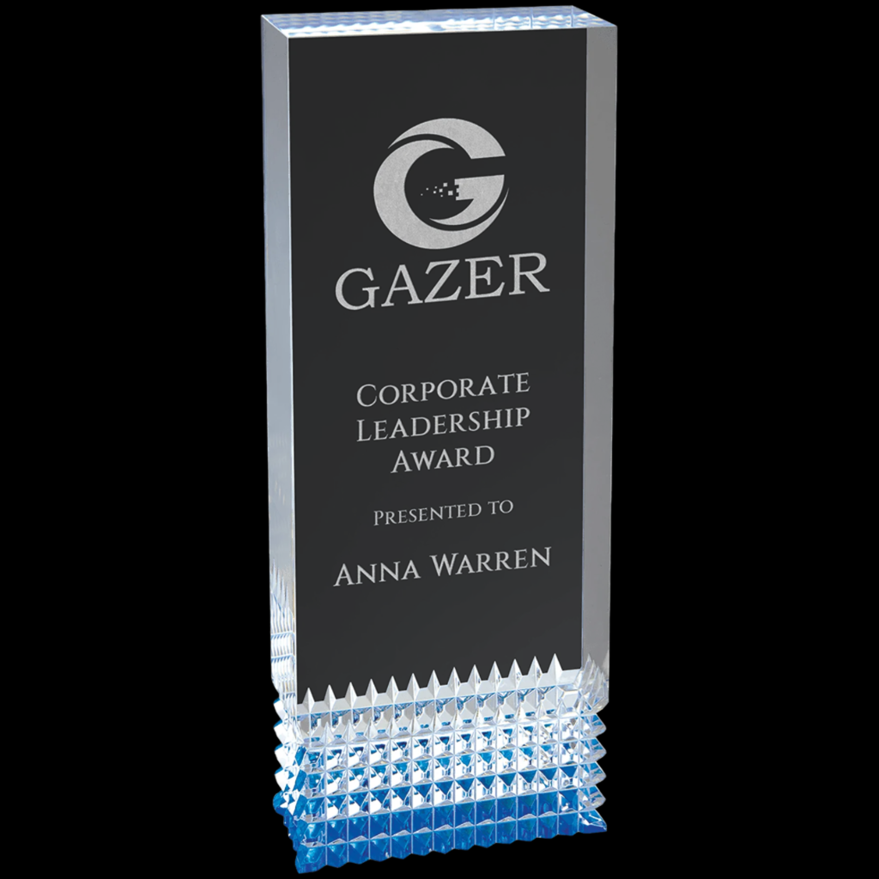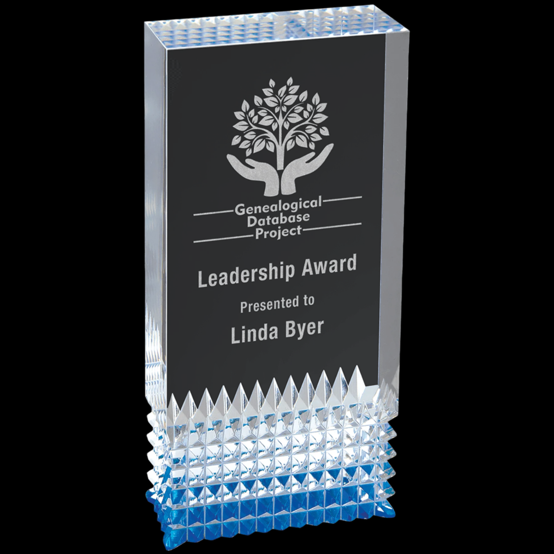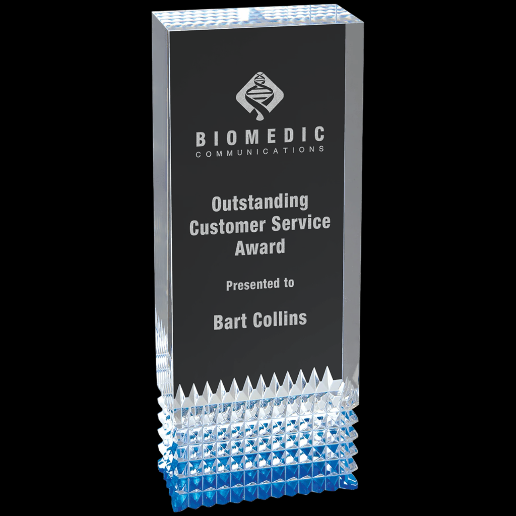 Blue Tribute Acrylic panels stand 1.25 inches tall and feature a self-standing design for easy placement. Their ice-like appearance delivers a crisp, clean aesthetic, making them ideal for professional displays or modern decor settings. Durable and visually striking, these acrylics combine functionality with refined style.