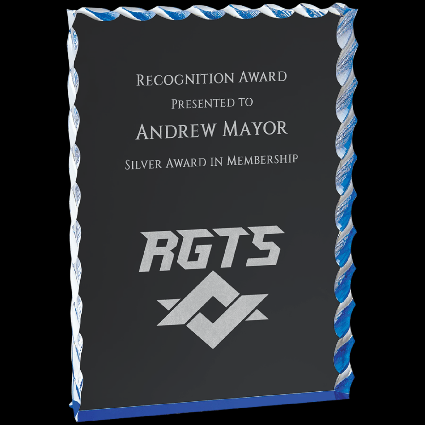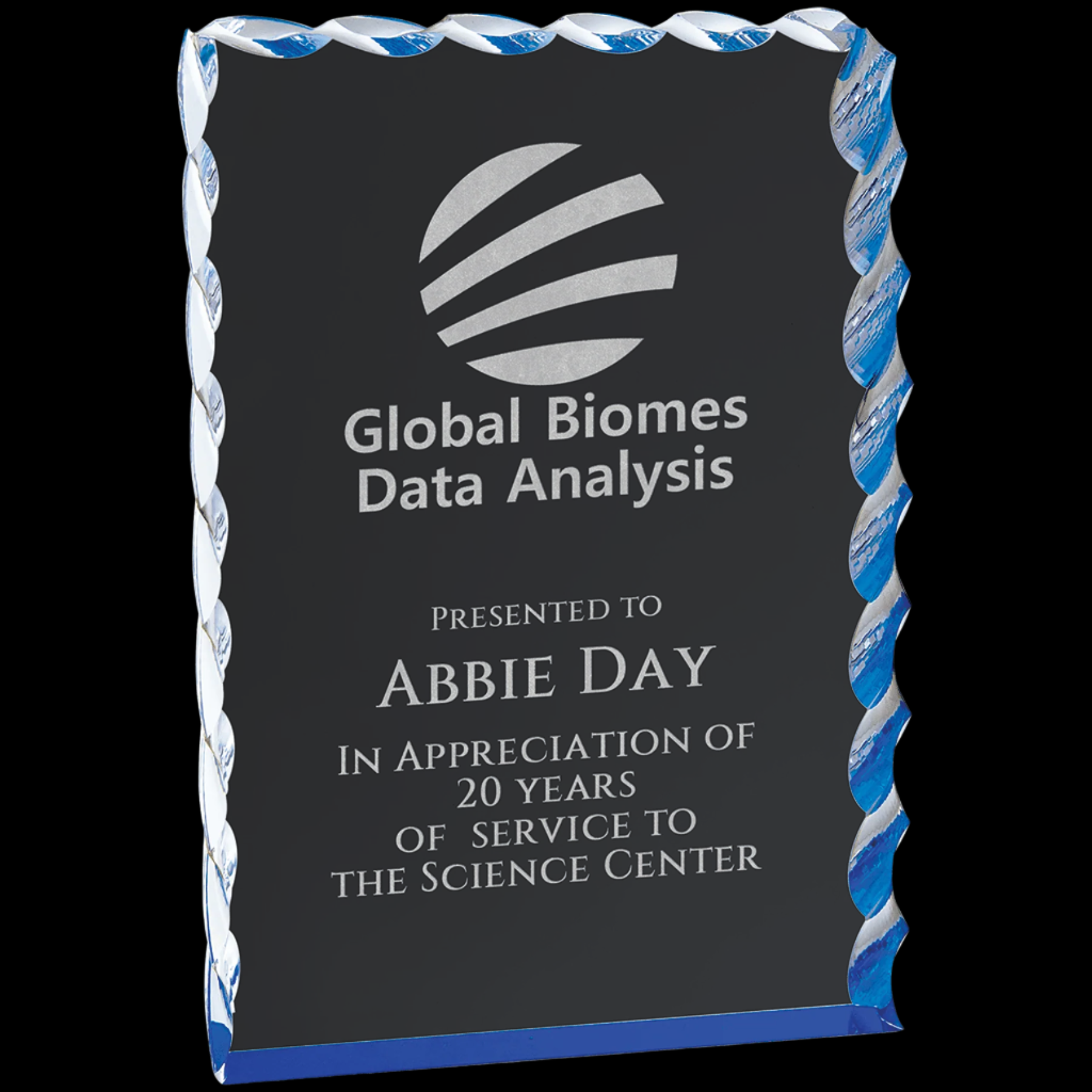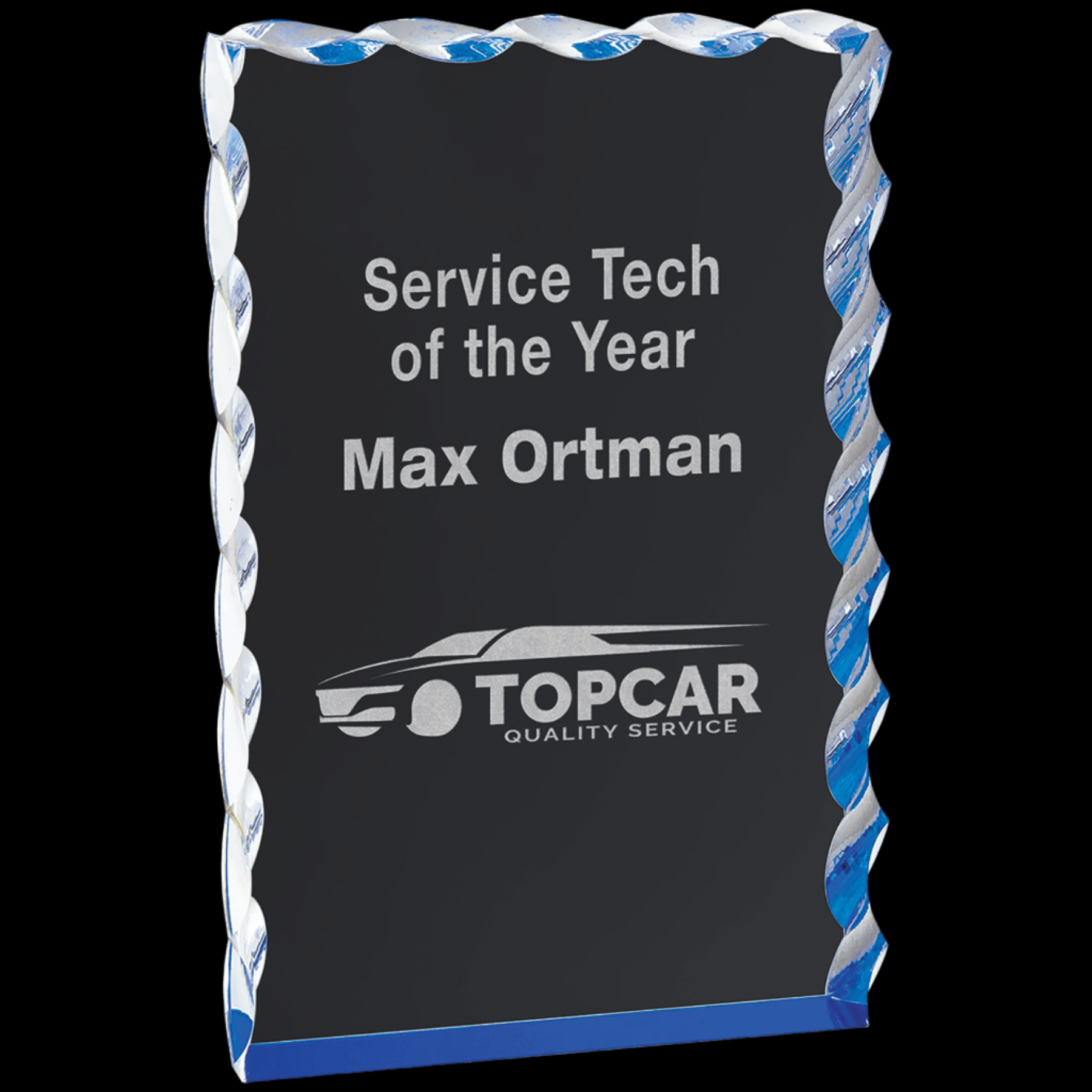 Wave Edge Acrylic awards feature a distinctive 1" scalloped waved edge that adds a modern twist to classic designs. These self-standing awards are crafted for stability and visual appeal, available in various colors and sizes to suit diverse recognition needs. The Blue Wave Edge Acrylic combines elegance with durability, making it an excellent choice for professional and memorable awards.