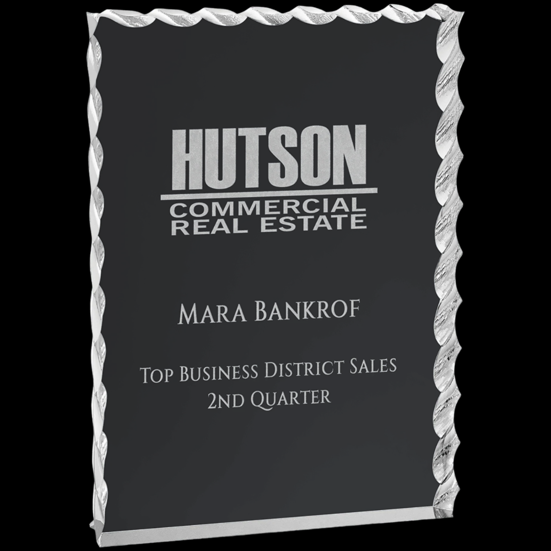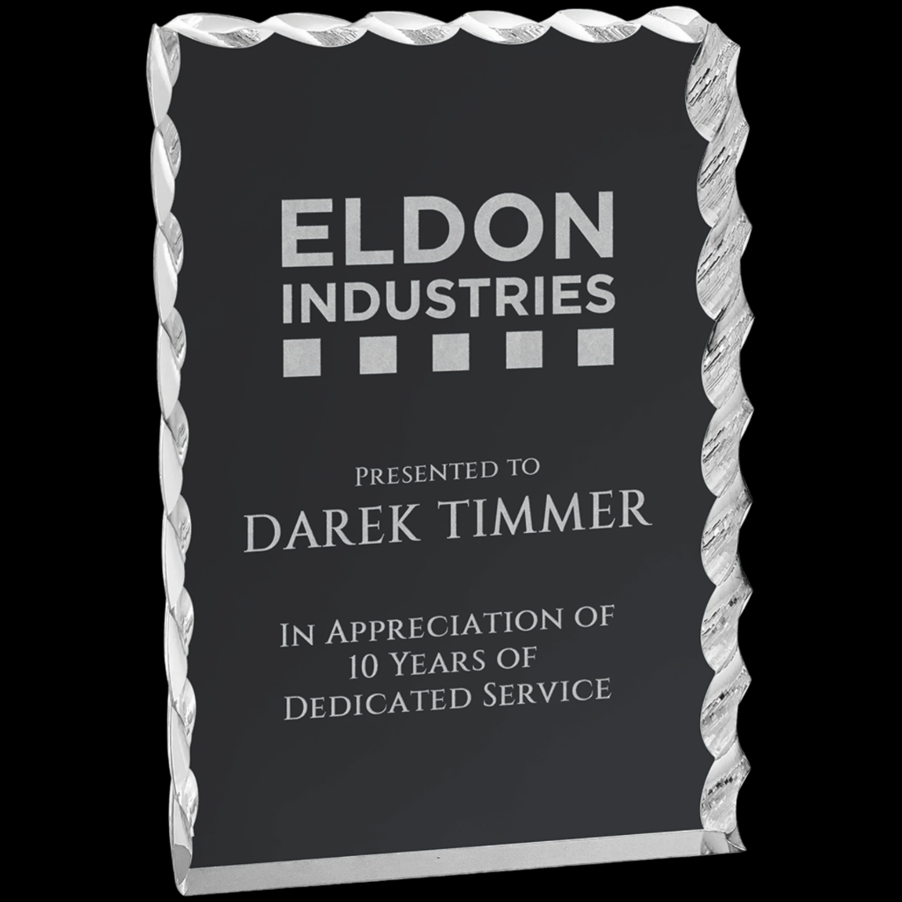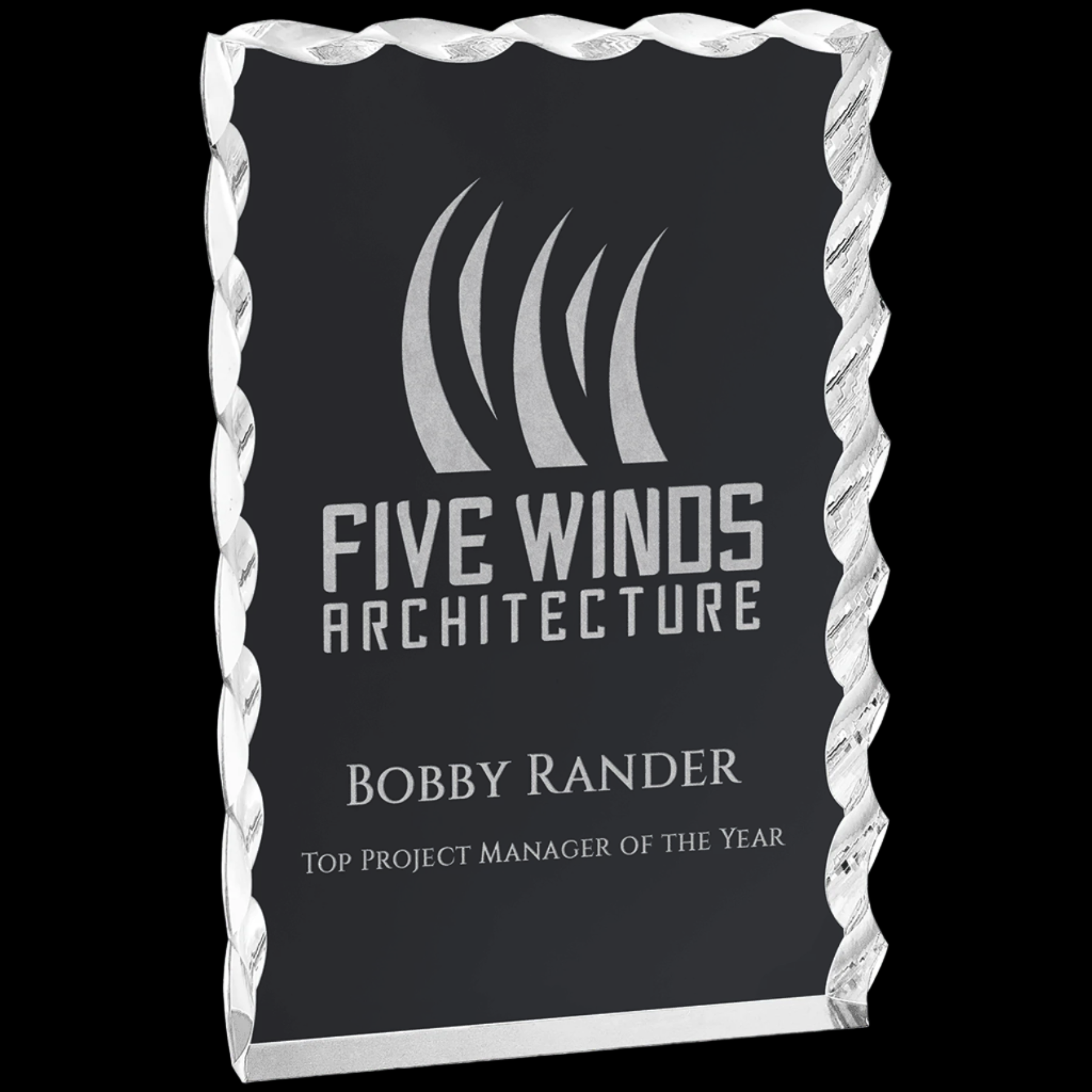 Wave Edge Acrylic awards feature a distinctive 1" scalloped waved edge that elevates traditional award designs with a modern twist. These self-standing acrylics are available in multiple colors and sizes, offering versatile options to suit various recognition needs. Crafted for durability and visual impact, the Silver Wave Edge Acrylic combines elegance with functionality, making it an excellent choice for professional awards and commemorations.