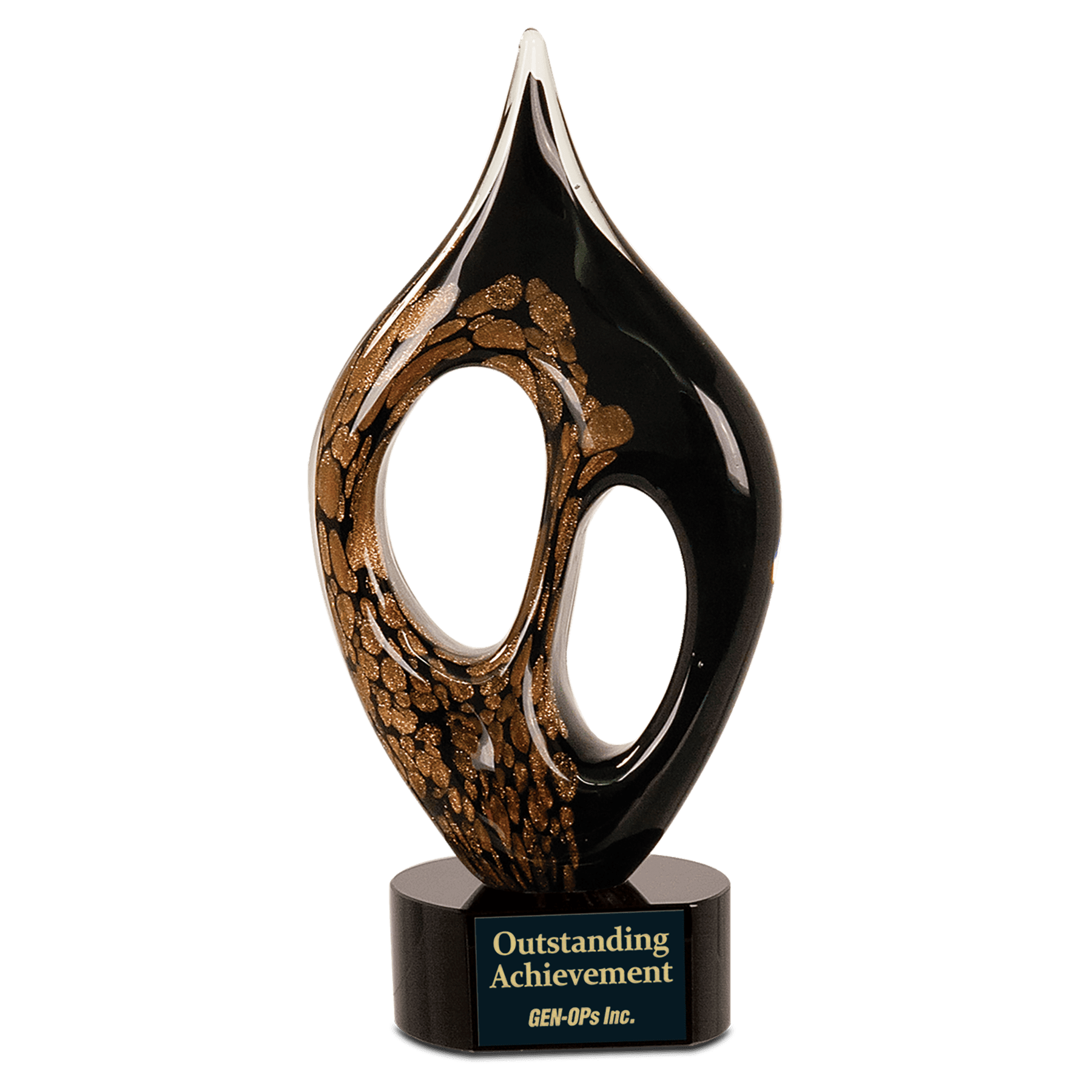 Artistically Inspired Hand Blown Glass Sculpture. Each Piece is Uniquely Different, and Colors and Sizes Will Vary Slightly. It Will Be Mounted on a Black Glass Base.