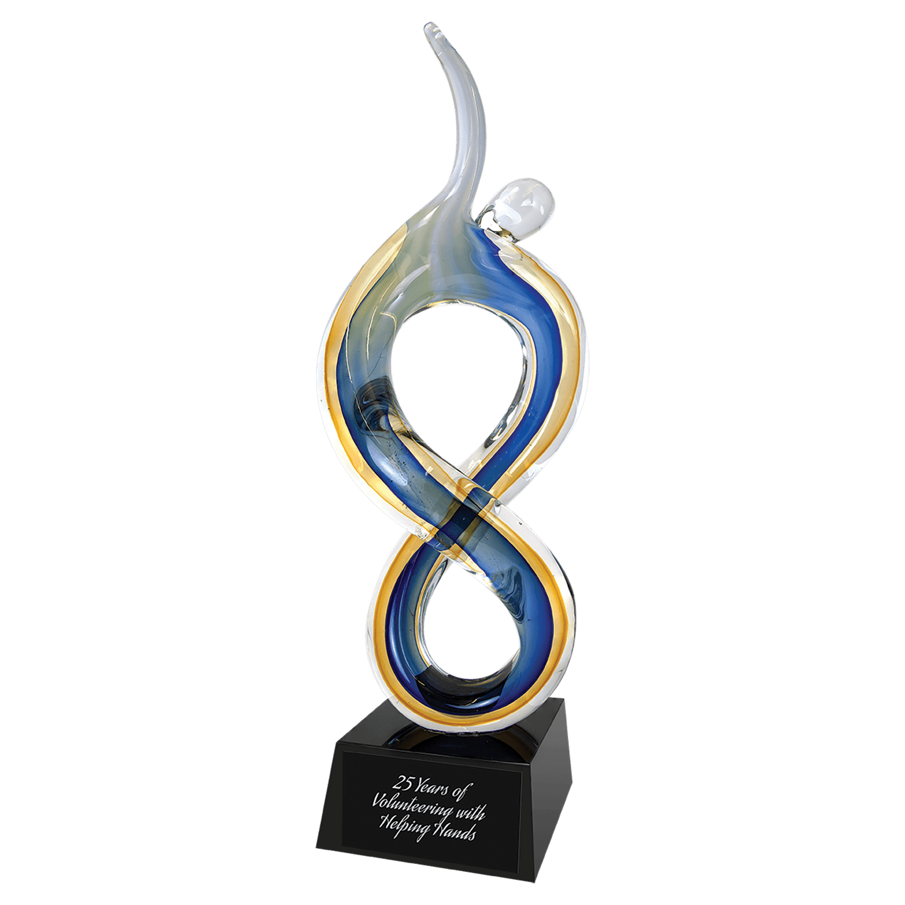 Artistically Inspired Hand Blown Glass Sculpture. Each Piece is Uniquely Different, and Colors and Sizes Will Vary Slightly. It Will Be Mounted on a Black Glass Base.