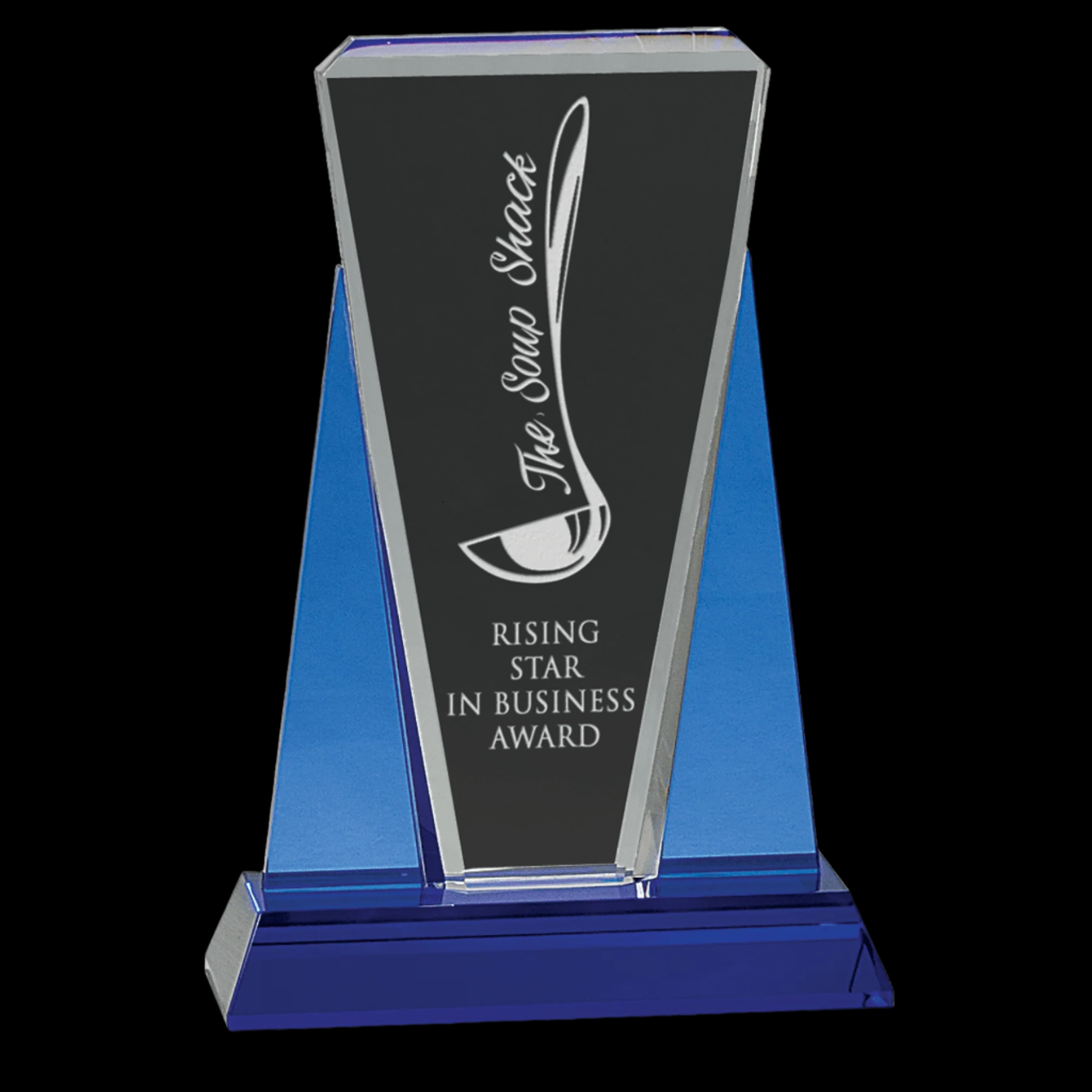 Our Crystal Awards are Handmade and May Vary Slightly in Size. Clear Optic Crystal Wedge with Blue Accents Attached to Blue Pedestal Base. Packaged in a Lined Gift Box.