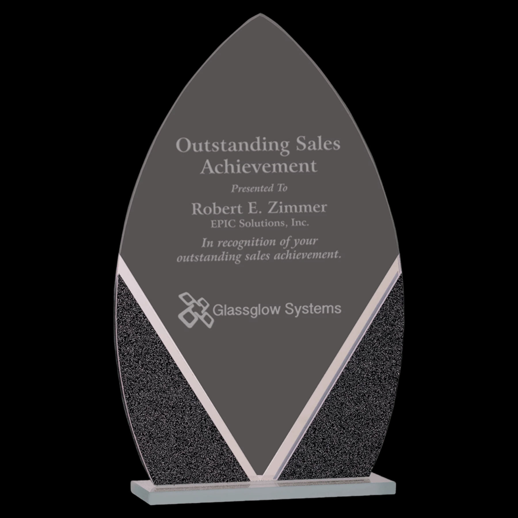 The Oval Designer Glass Award features a reflective mirrored back detail that enhances its visual depth and elegance. Crafted from .125" thick designer glass, it is securely mounted on a sturdy glass base, ensuring both durability and a premium presentation. This award combines sophisticated design with quality materials, making it an excellent choice for recognizing outstanding achievements.