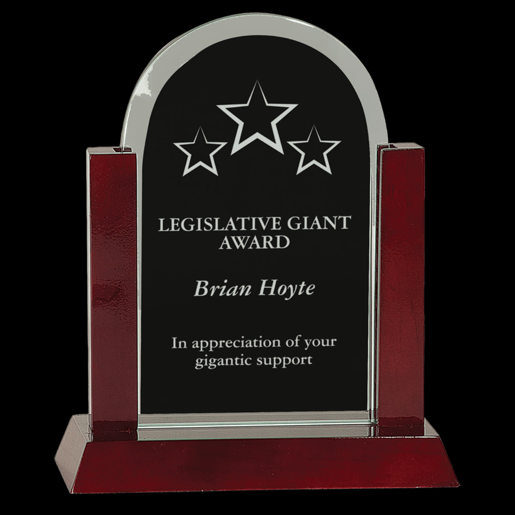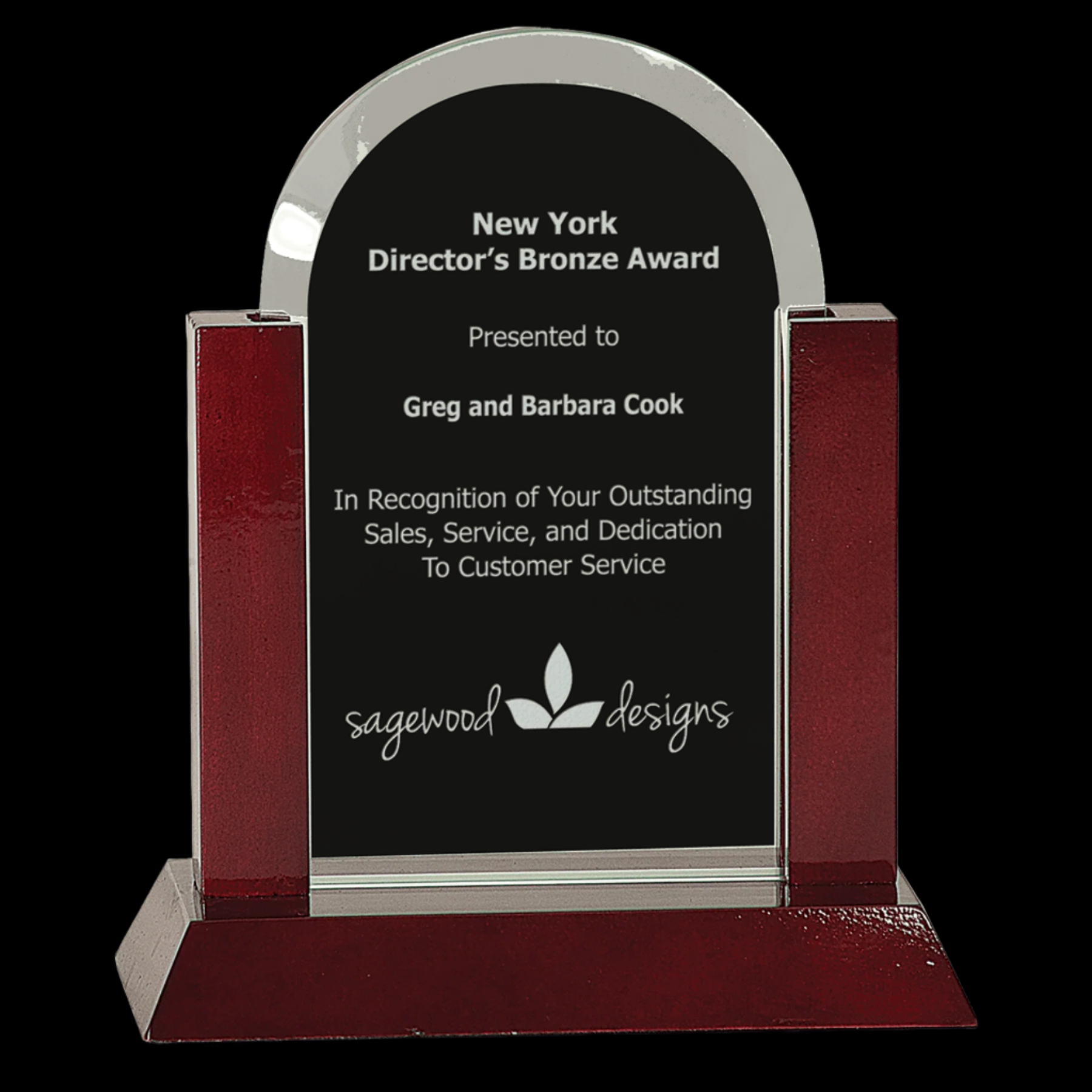 The Gateway Jade Dome Glass Award features a durable .375" thick jade glass dome that rests securely yet loosely on a polished rosewood finish base. This combination offers a sophisticated presentation, ideal for recognizing achievements with elegance and lasting appeal.