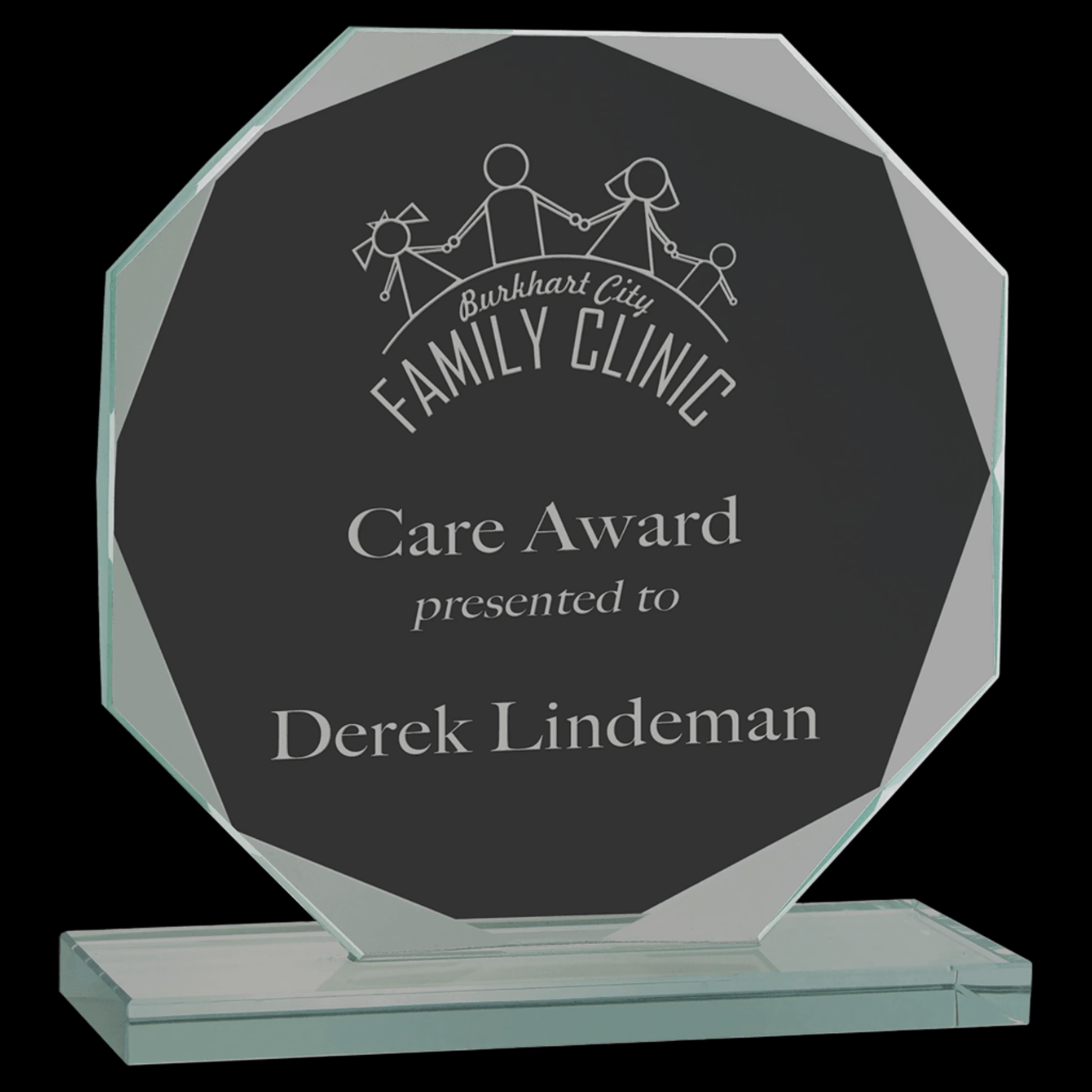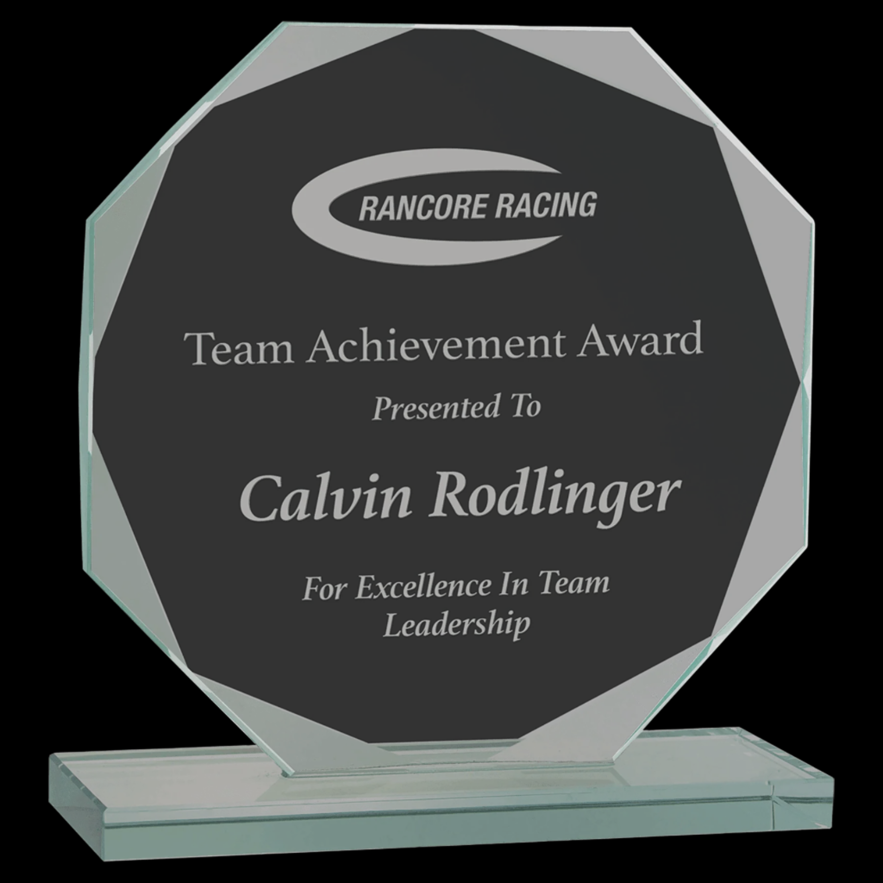 Crafted with precision, the Octagon Jade Glass Award features a robust .375" thick jade glass mounted securely on a glass base. Available in multiple sizes and styles, this award offers a sophisticated and durable option for recognizing excellence with a timeless design.