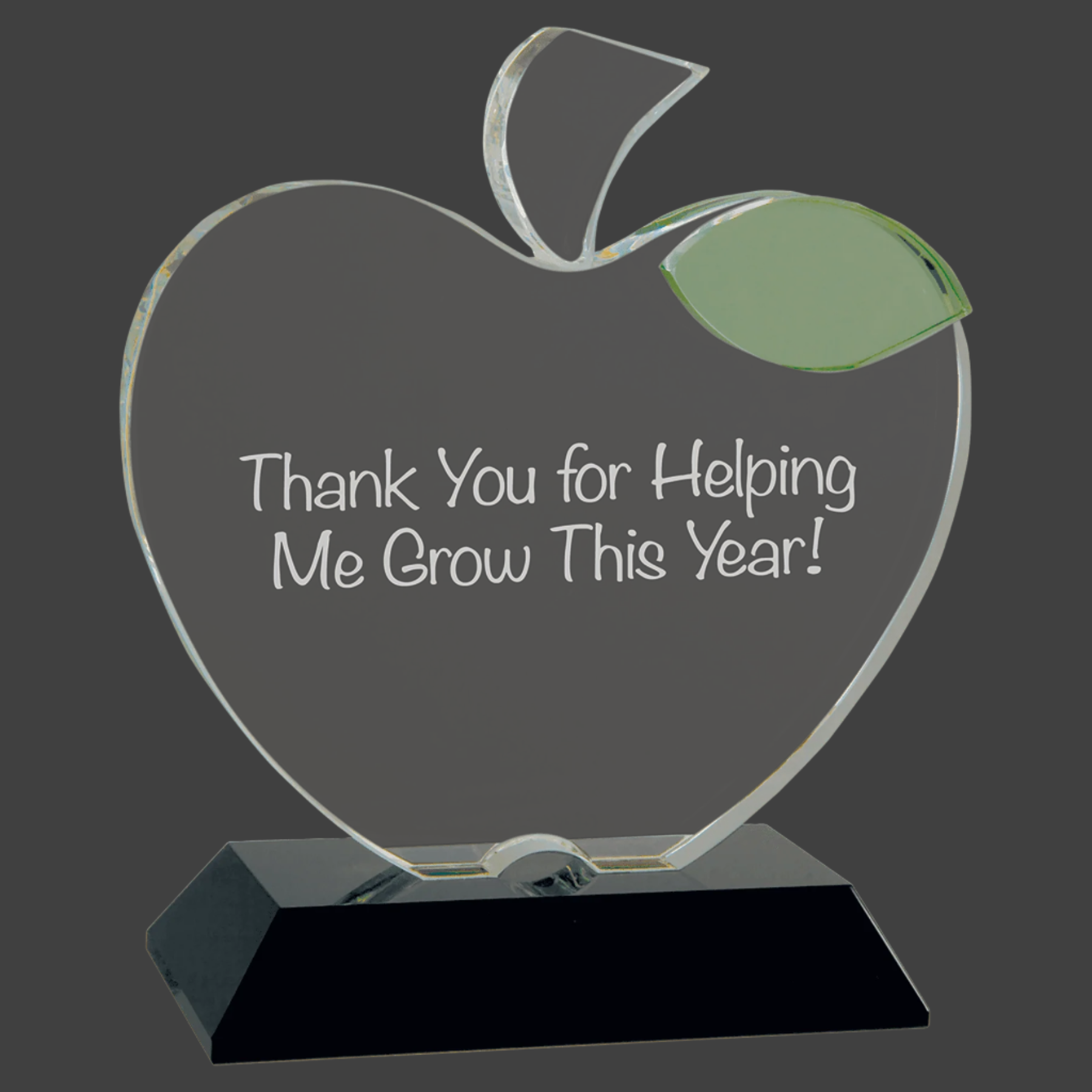 Our Crystal Apple features a meticulously handcrafted optic crystal apple with a vibrant green leaf, elegantly mounted on a sleek black crystal base. Measuring approximately 5.5" by 6.25", each piece may vary slightly in size due to its handmade nature, ensuring a unique and refined look. Presented in a lined gift box, this sophisticated item is perfect for awards, corporate gifts, or decorative displays.