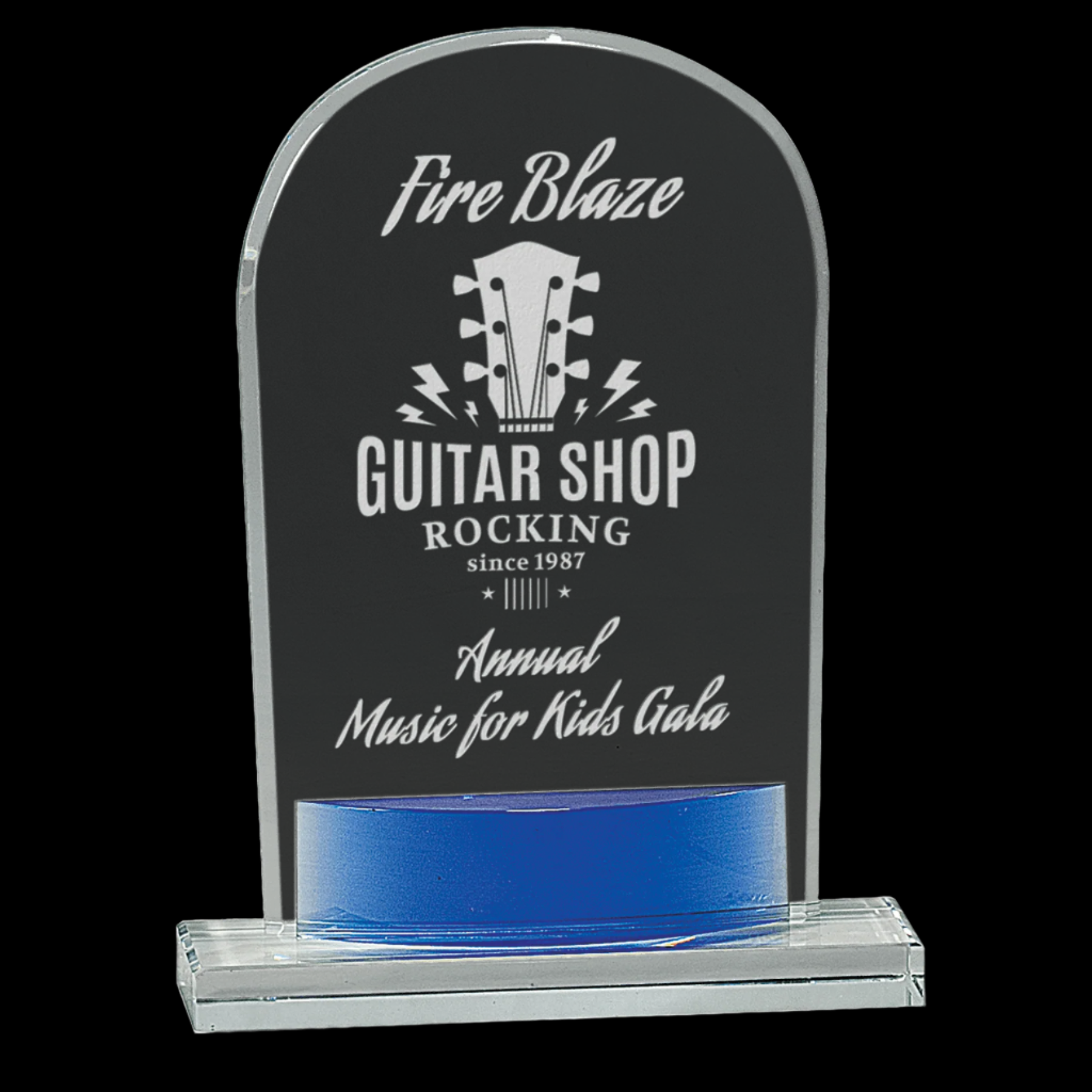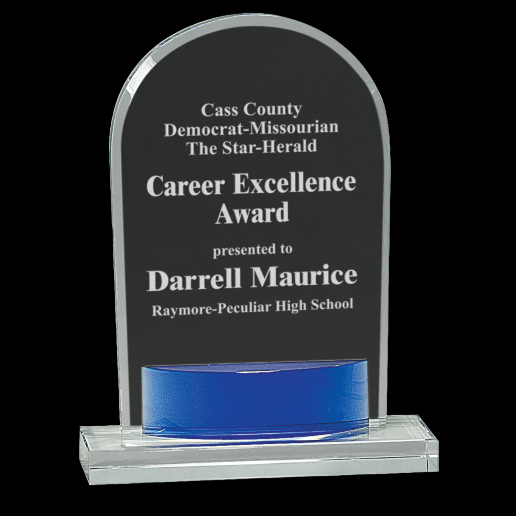 Our Crystal Arch with Blue Accent is expertly handcrafted, featuring a clear optic crystal arch elegantly mounted on a clear base with a subtle decorative blue touch. Each piece may vary slightly in size, reflecting its unique handmade quality. Presented in a lined gift box, this award combines refined craftsmanship with a distinguished appearance, perfect for recognizing outstanding achievements.