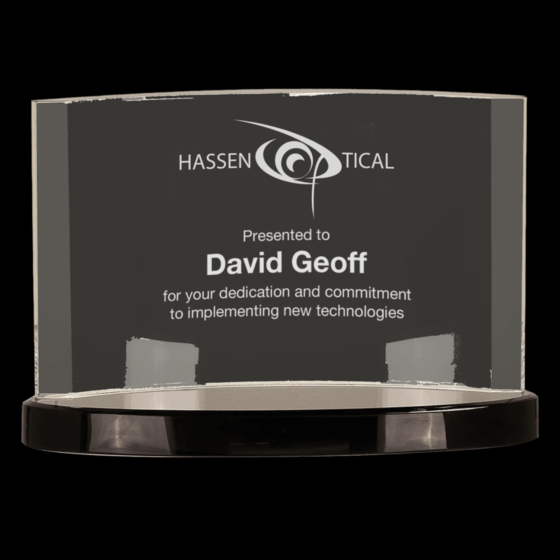 Our Crystal Awards are Handmade and May Vary Slightly in Size. Clear Optic Crystal Crescent Attached to Black Crystal Base. Packaged in a Lined Gift Box.