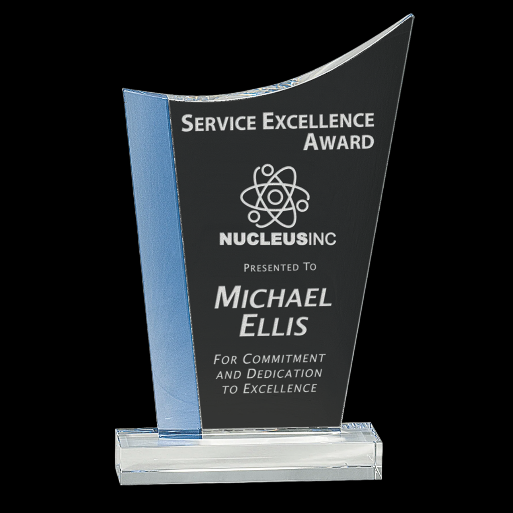 Our Crystal Awards are Handmade and May Vary Slightly in Size. Clear Optic Crystal Crest with Blue Edge Attached to Clear Base. Packaged in a Lined Gift Box.