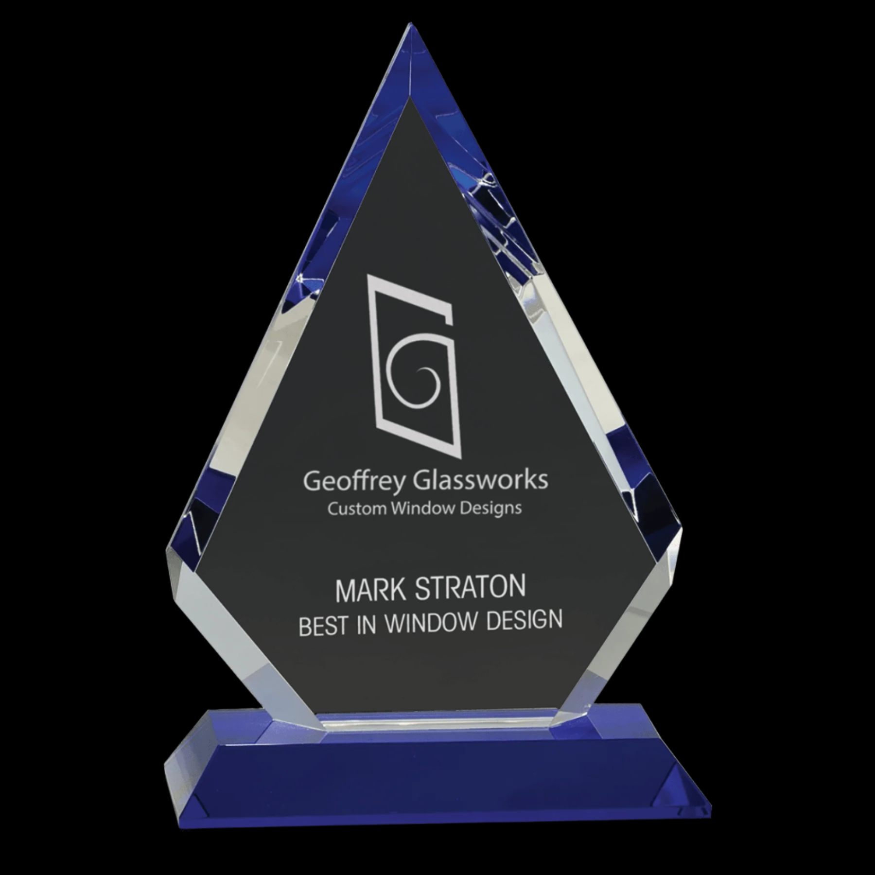 Our Crystal Awards are Handmade and May Vary Slightly in Size. Clear Optic Crystal Diamond with Bevel Edge Attached to Blue Pedestal Base. Packaged in a Lined Gift Box.