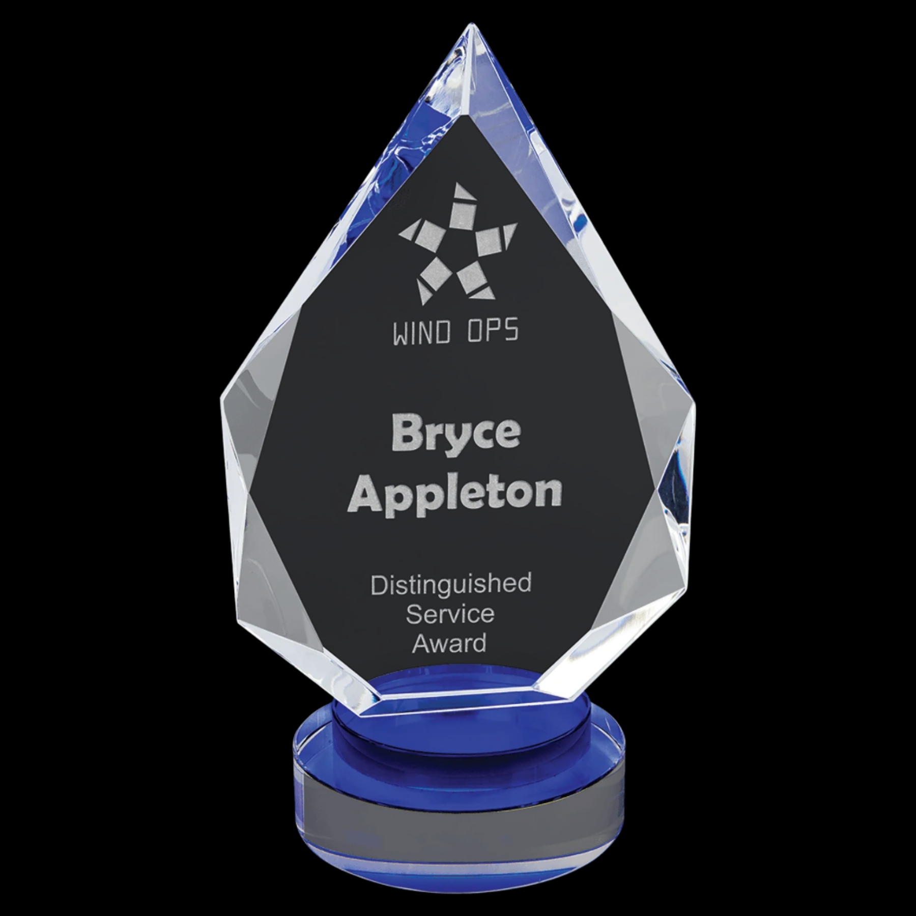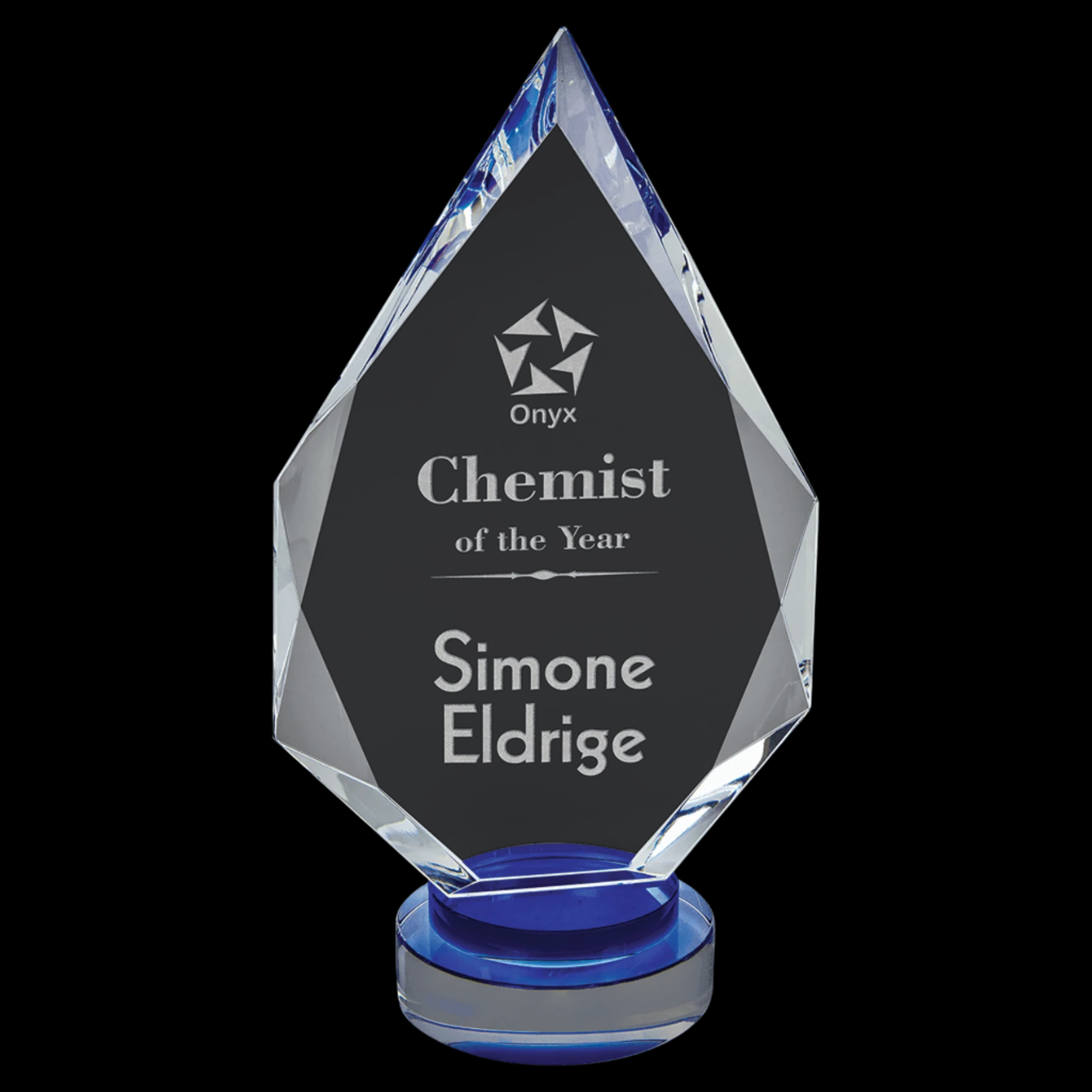 Our Diamond Crystal on Blue & Clear Round Base is a meticulously handcrafted award featuring an optic crystal facet diamond set atop a striking black and clear round base. Each piece may vary slightly in size, reflecting its unique handmade quality. Presented in a lined gift box, this elegant award is perfect for recognizing excellence with a sophisticated touch.