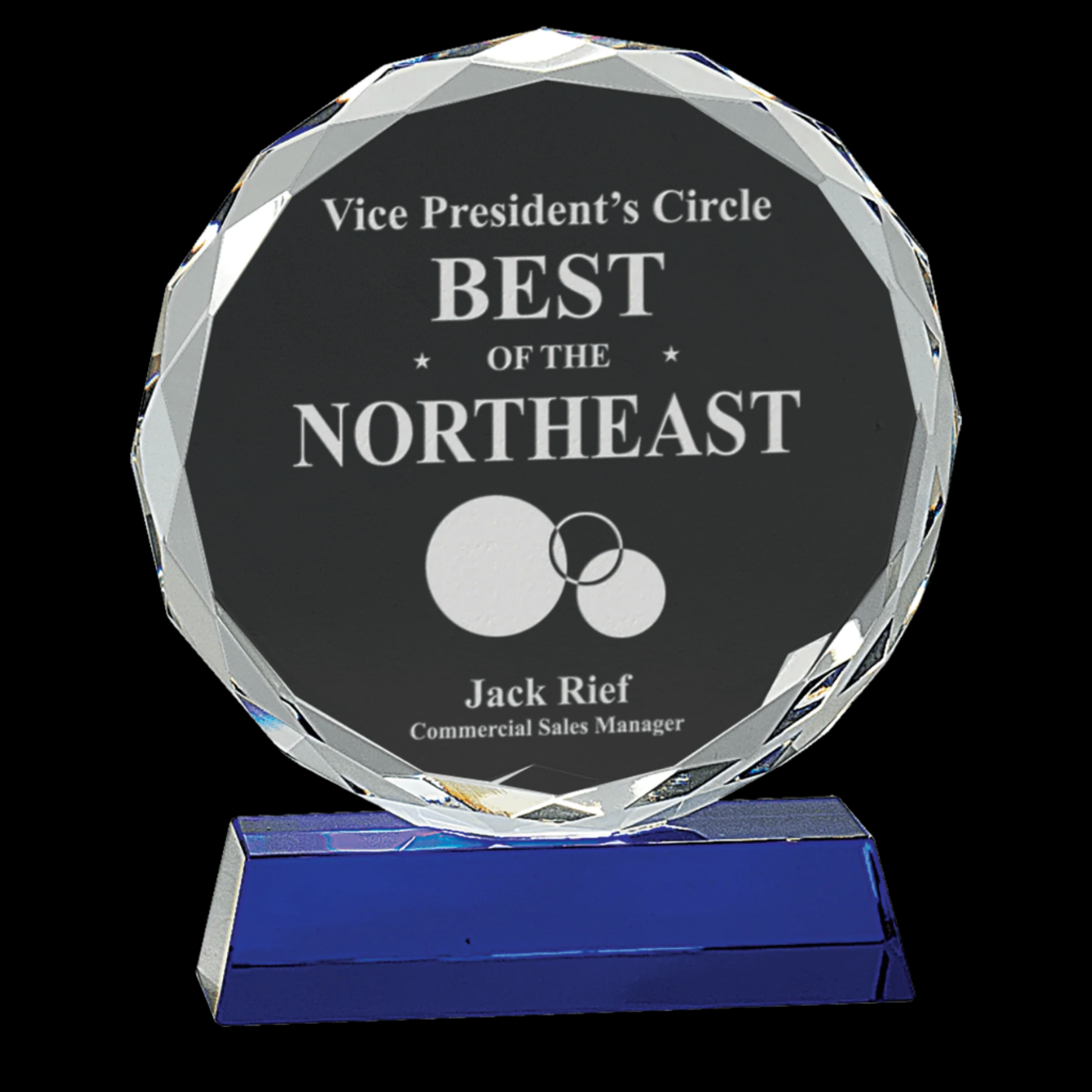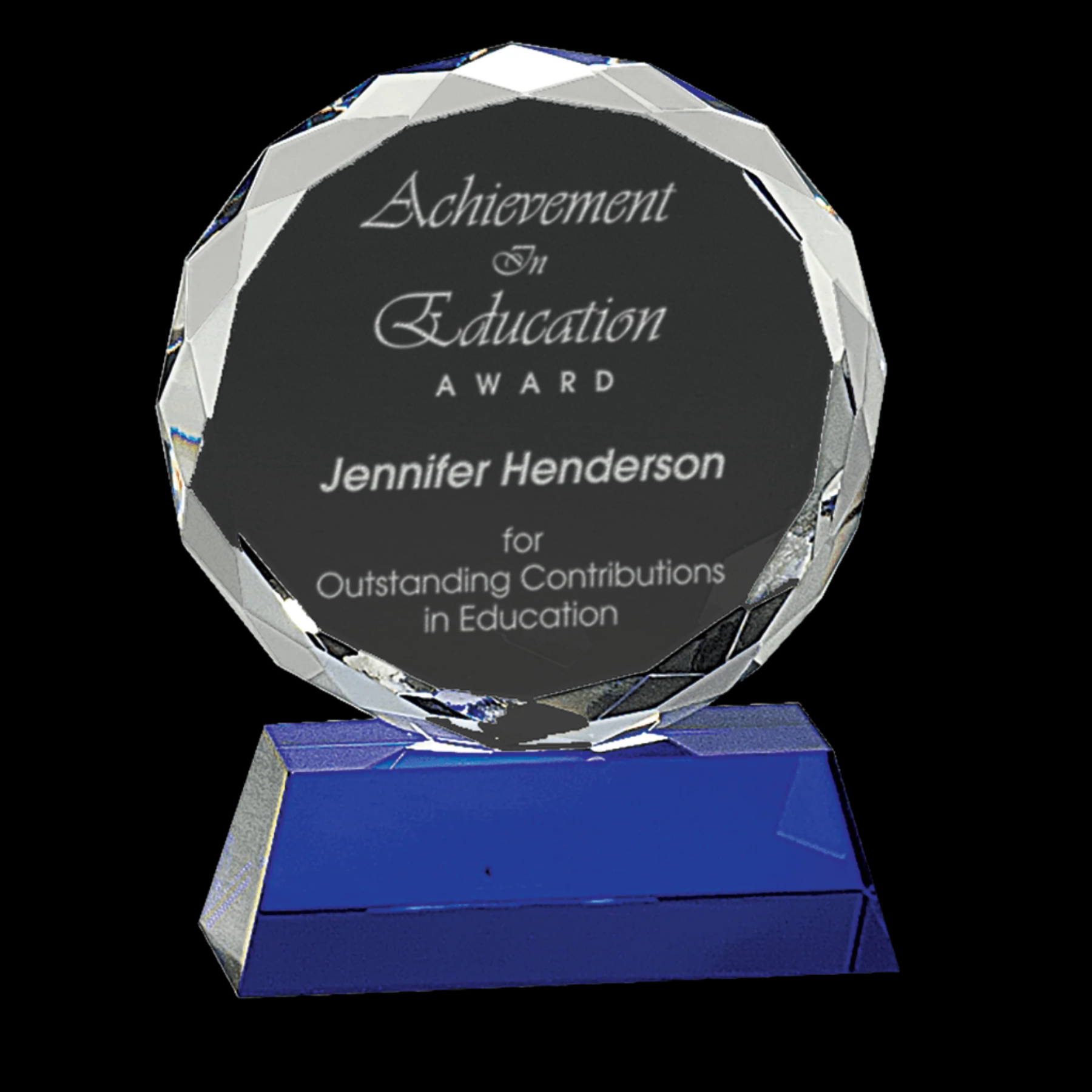 Our Round Facet Crystal on Blue Pedestal Base is a meticulously handcrafted award, featuring a striking round facet optic crystal securely mounted on a vibrant blue pedestal. Each piece is unique, with slight size variations that highlight its handmade quality. Presented in a lined gift box, this award combines elegance and craftsmanship, making it an exceptional choice for recognizing achievement.