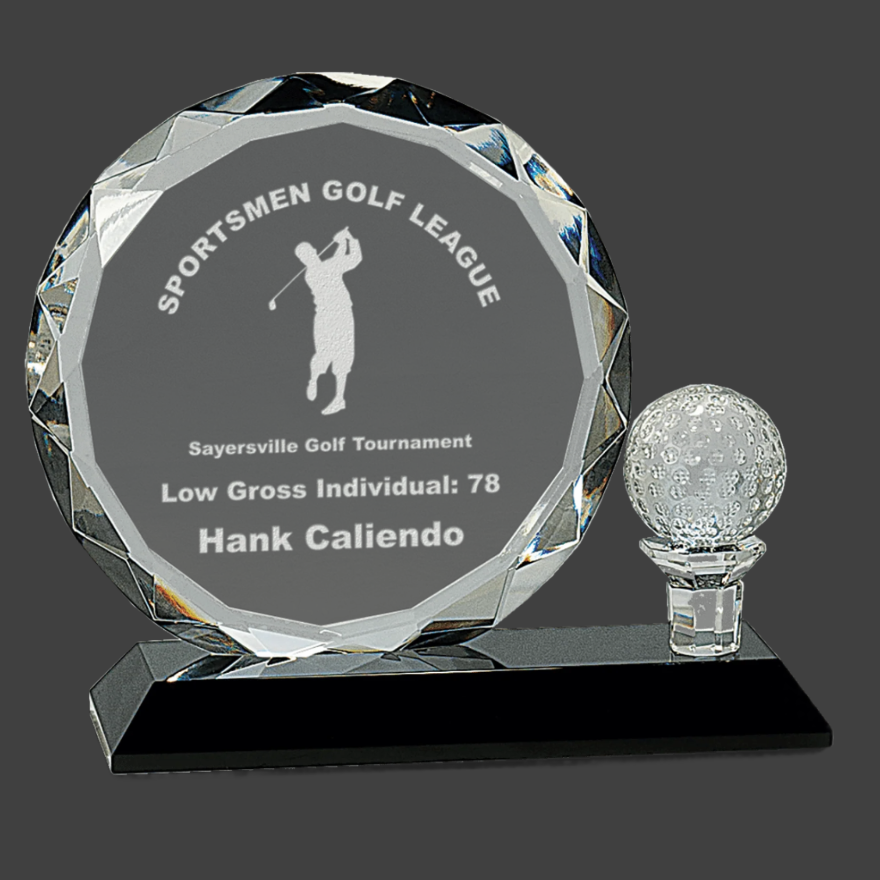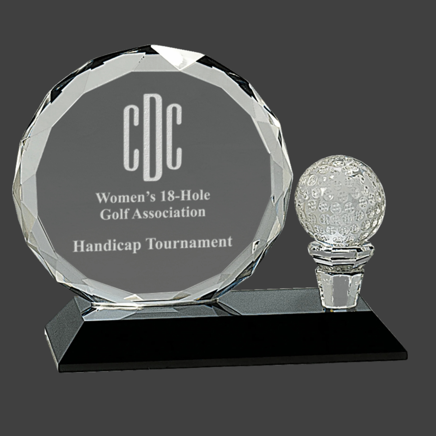 Round Facet Crystal with Golf Ball On Black Pedestal Base