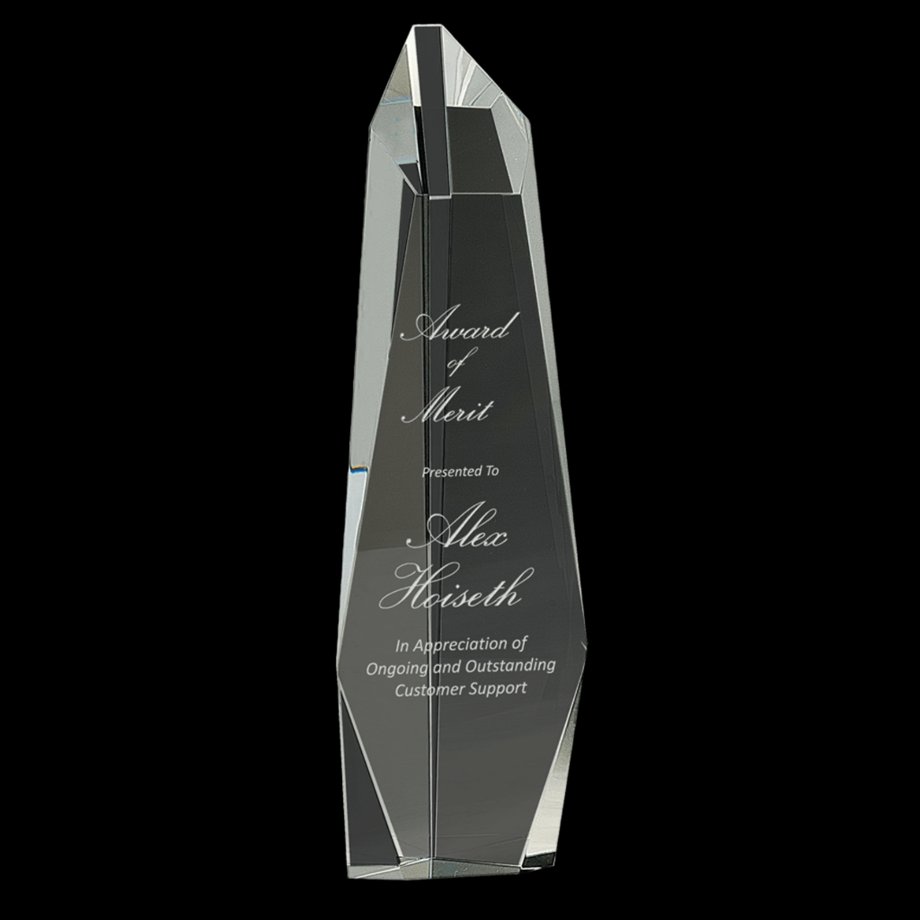 Our 12" Clear Crystal Facet Slant-Top Tower is expertly handcrafted, ensuring each piece is unique with slight size variations. Its optic crystal clarity and distinctive slant-top design create a striking presence, perfect for prestigious awards or recognition. Delivered in a lined gift box, it offers an elegant presentation ready for any special occasion.
