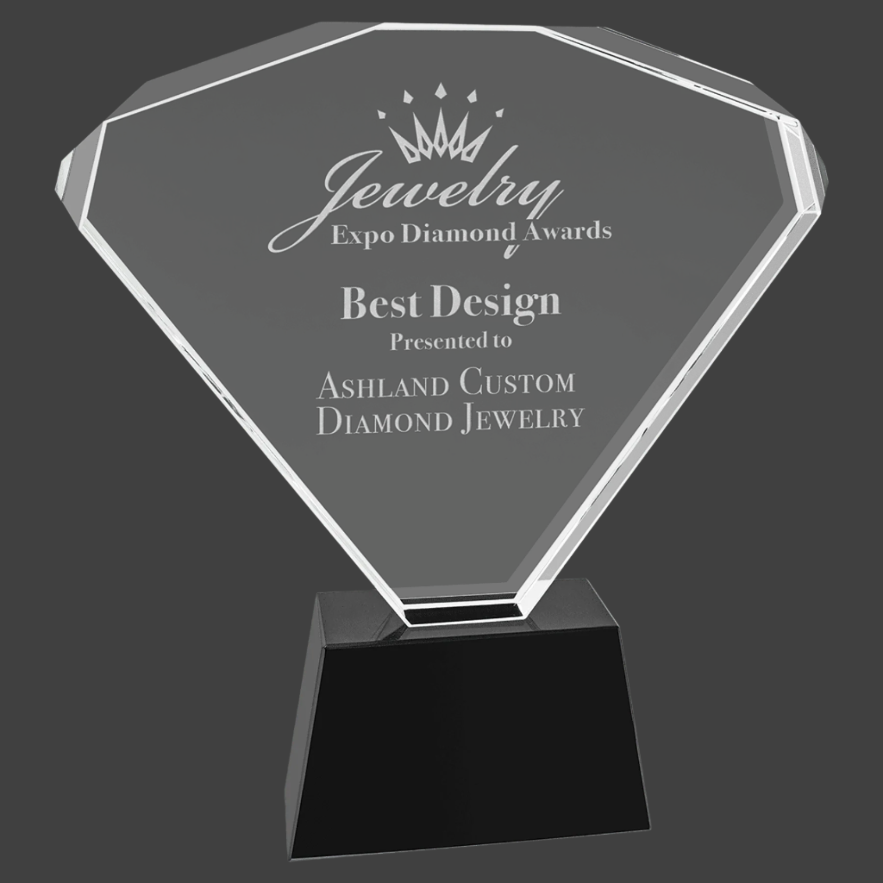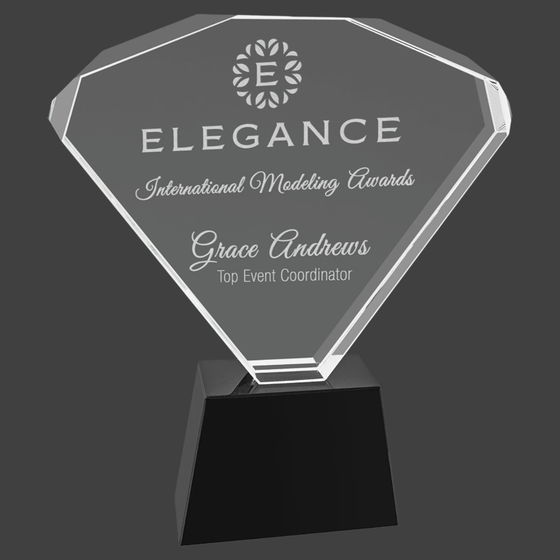 Our Crystal Fan with Black Base is a meticulously handcrafted award, featuring a crystal fan elegantly mounted on a sleek black pedestal. Each piece is unique, with slight size variations that highlight its artisanal quality. Designed with a double-sided crystal fan, it offers two distinct visual perspectives, enhancing its appeal. Presented in a lined gift box, this award combines sophistication and craftsmanship, making it an exceptional choice for honoring achievements.