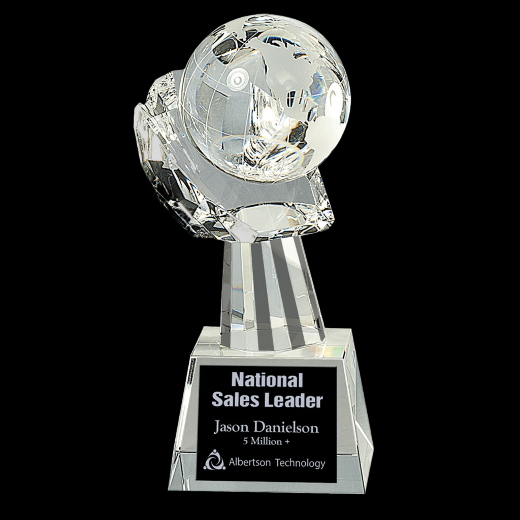 Our Globe Crystal is Handmade and May Vary Slightly in Size. Globe Sits in Round Recess in the Palm of the Hand Which is Attached to Clear Optic Crystal Base. Packaged in a Lined Gift Box.