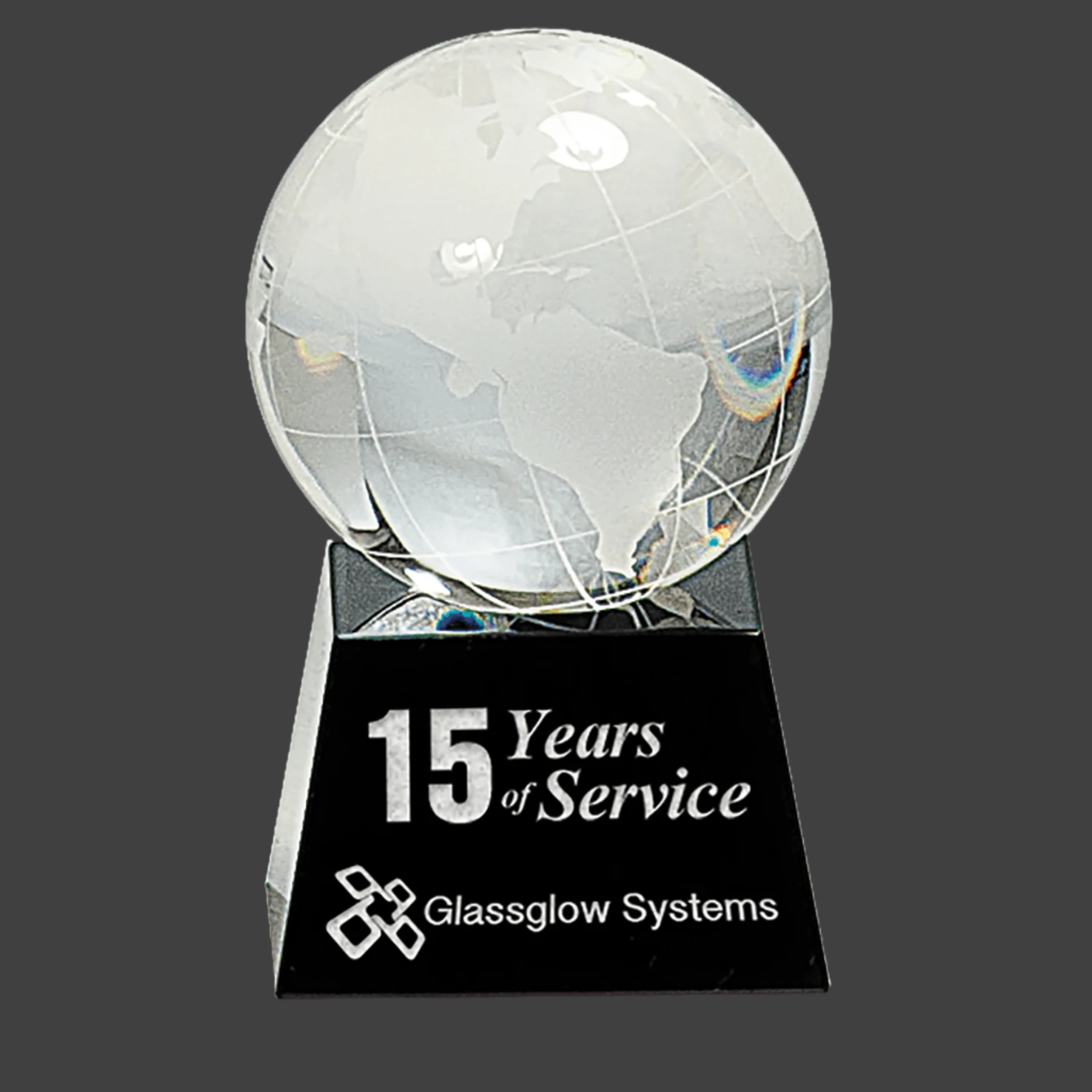 Our handcrafted Globe Crystal features frosted continents delicately etched on a clear optic crystal sphere. Each globe may vary slightly in size, reflecting its unique handmade nature. It rests securely in a recessed area on a sleek black crystal base, though the globe itself is not permanently attached. Presented in a lined gift box, this elegant piece combines artistry and precision, making it a distinguished addition to any collection or office.