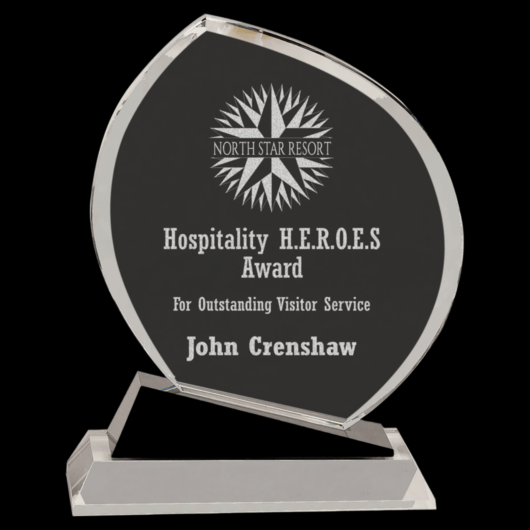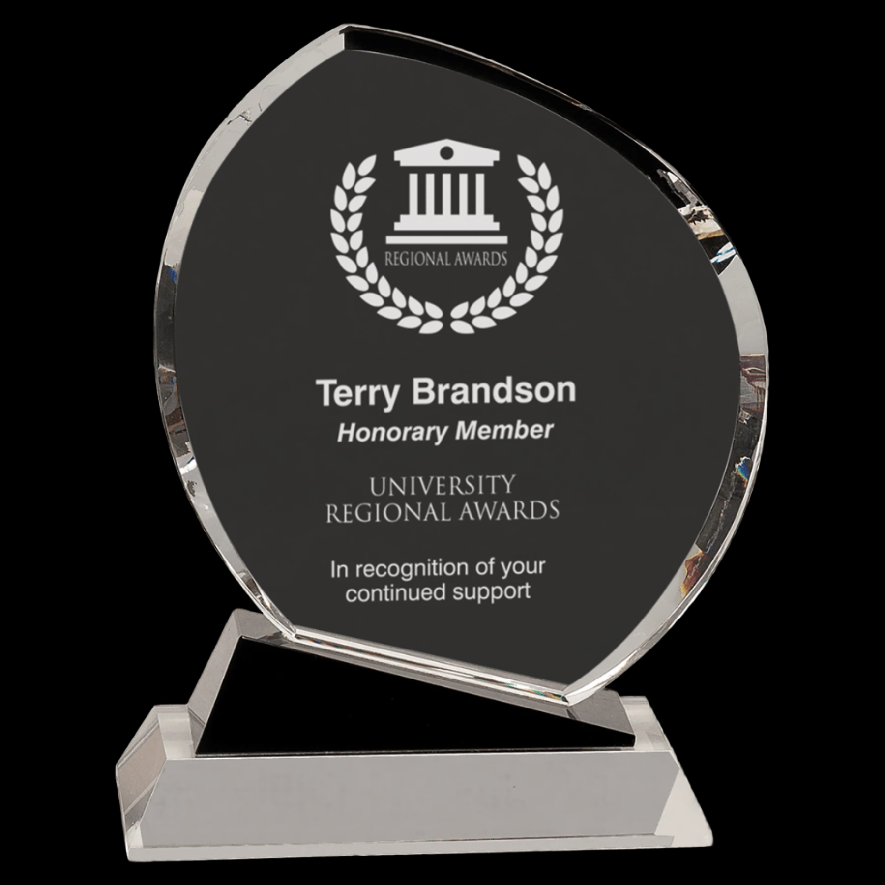 Our Crystal Oblong Awards feature a handcrafted optic crystal design with elegant black accents and a precise bevel edge. Each piece is mounted on a clear pedestal base, offering a sophisticated presentation. Slight size variations highlight the unique handmade quality. Delivered in a lined gift box, these awards combine artistry and refinement for distinguished recognition.