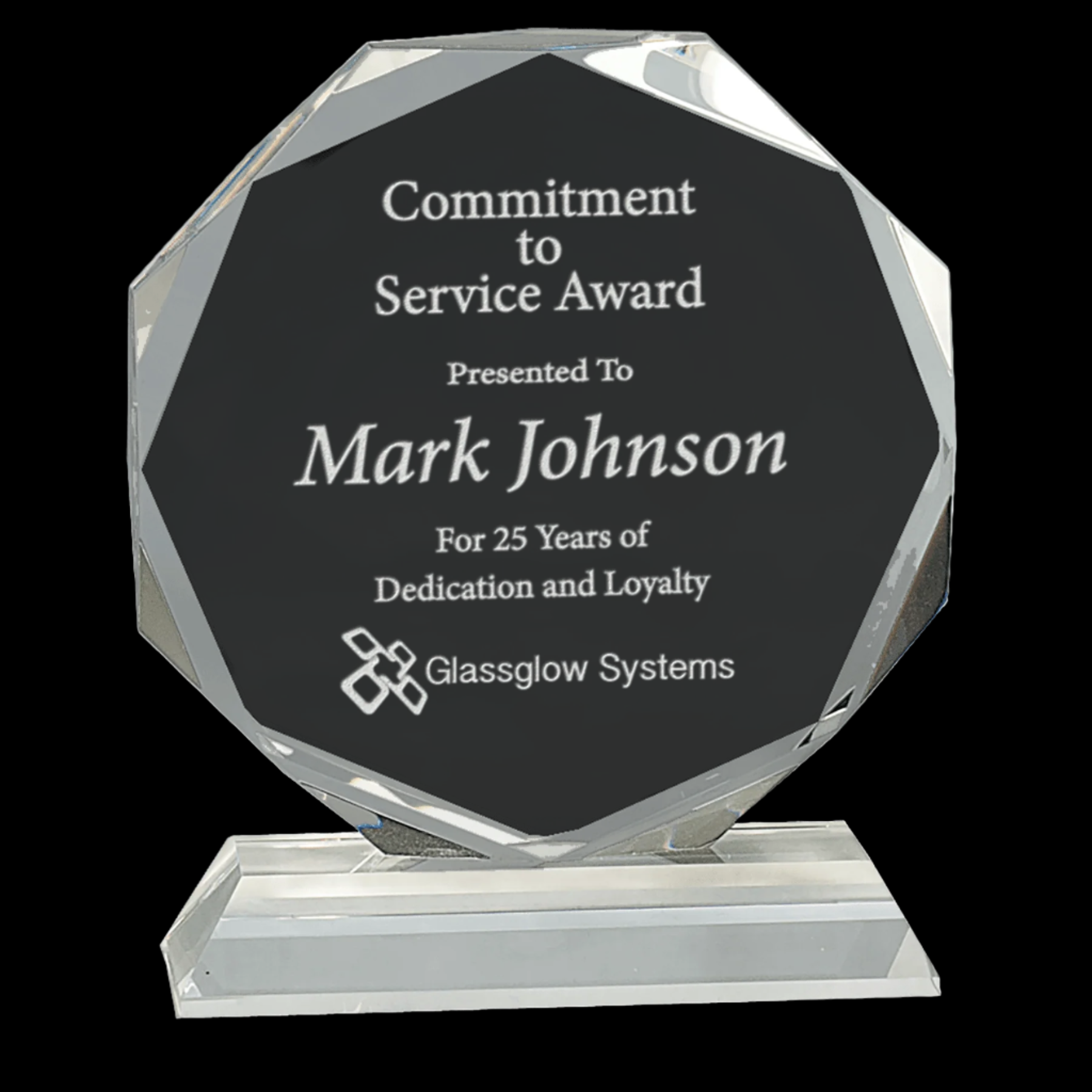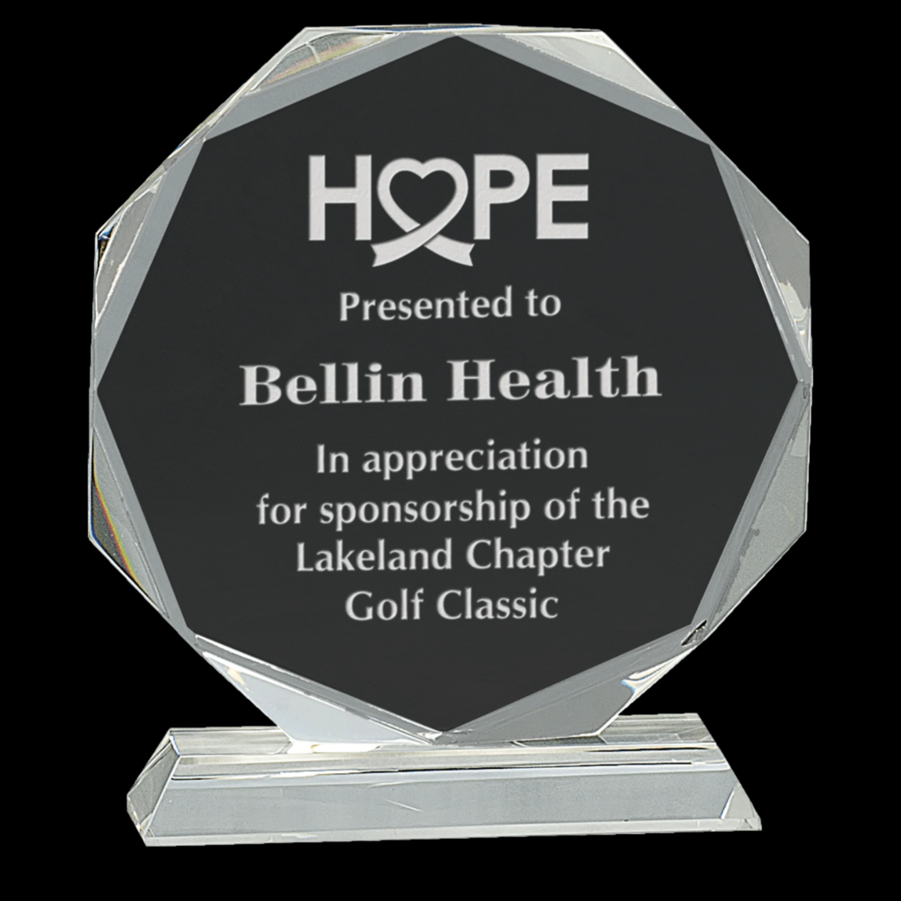 Our Crystal Awards are Handmade and May Vary Slightly in Size. Octagon Facet Optic Crystal Piece Attached to Clear Pedestal Base. Packaged in a Lined Gift Box.