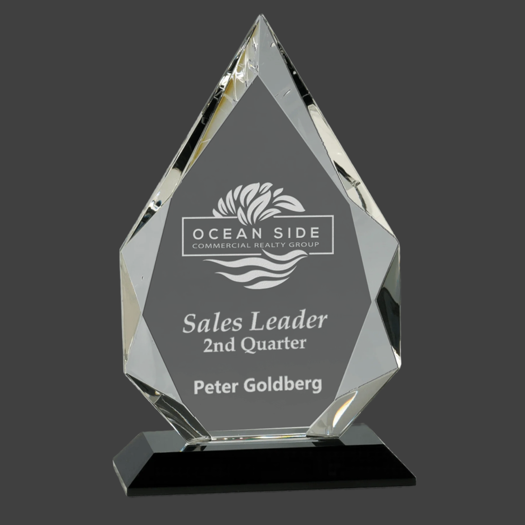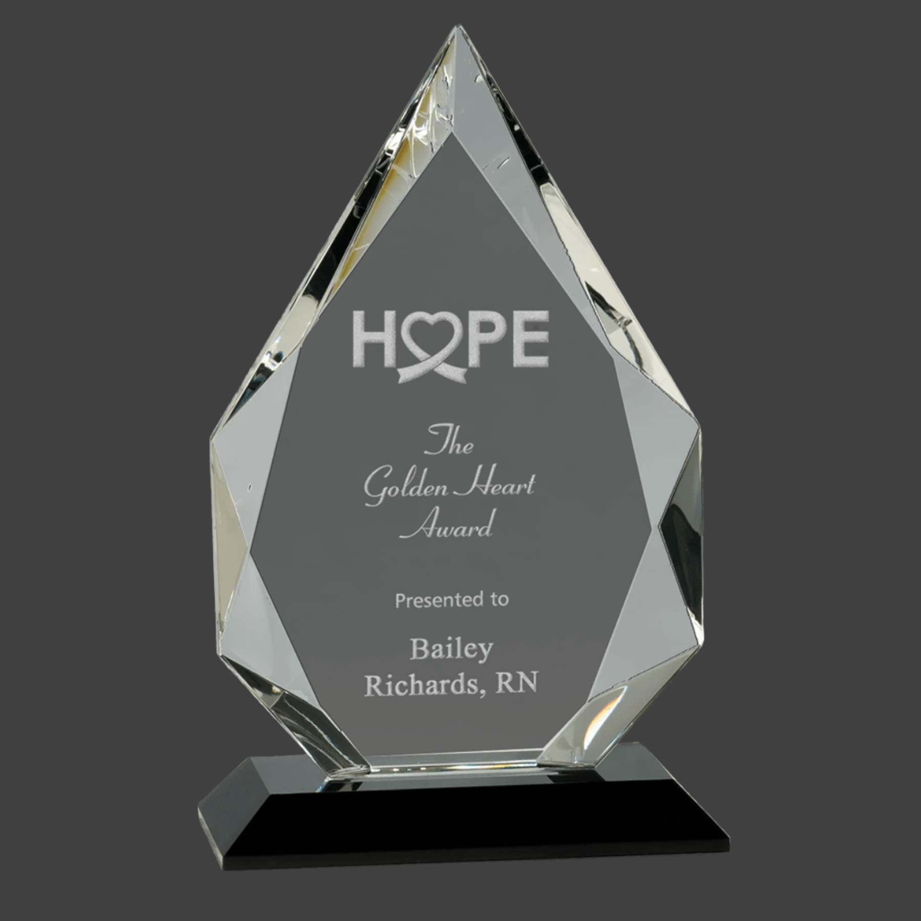 Our Diamond Crystal on Black Pedestal Base features a handcrafted diamond facet optic crystal, each piece uniquely sized. Mounted on a sleek black pedestal, this award combines elegance with durability. Delivered in a lined gift box, it’s ready to impress and honor achievements with distinction.