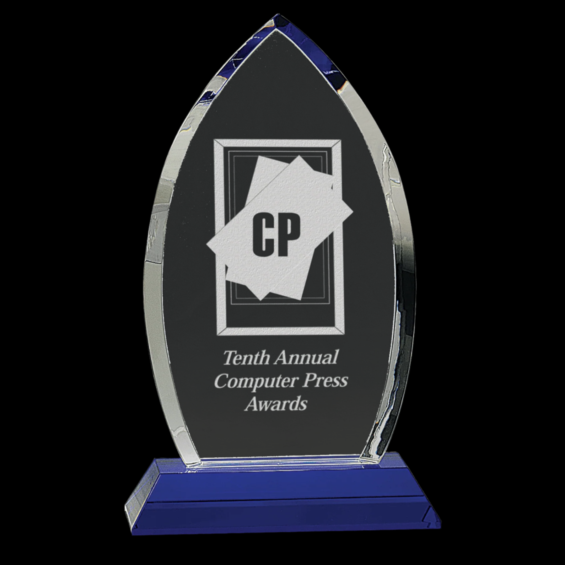 Our Crystal Awards are Handmade and May Vary Slightly in Size. Oval Optic Crystal with Bevel Edge Mounted to Blue Pedestal Base. Packaged in a Lined Gift Box.