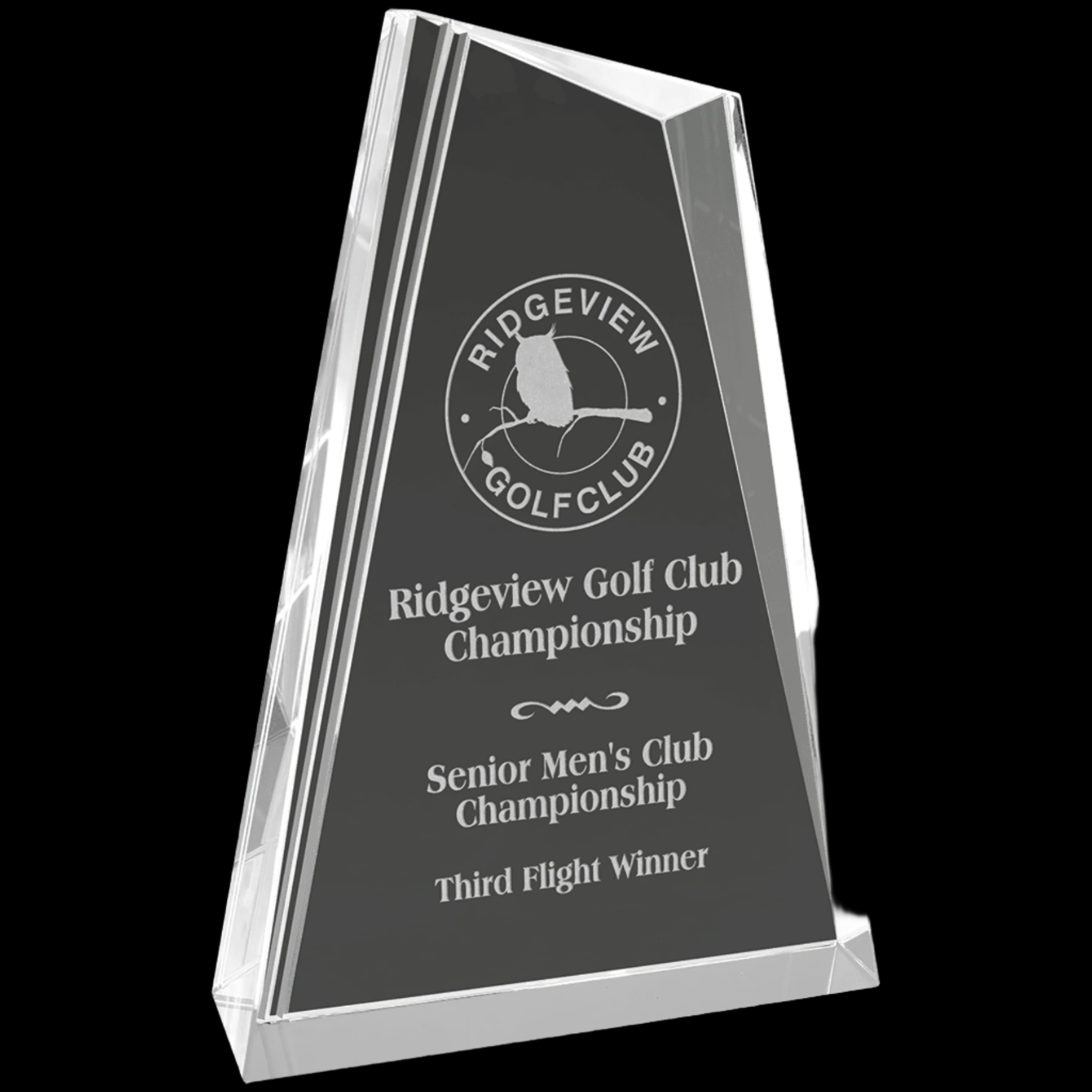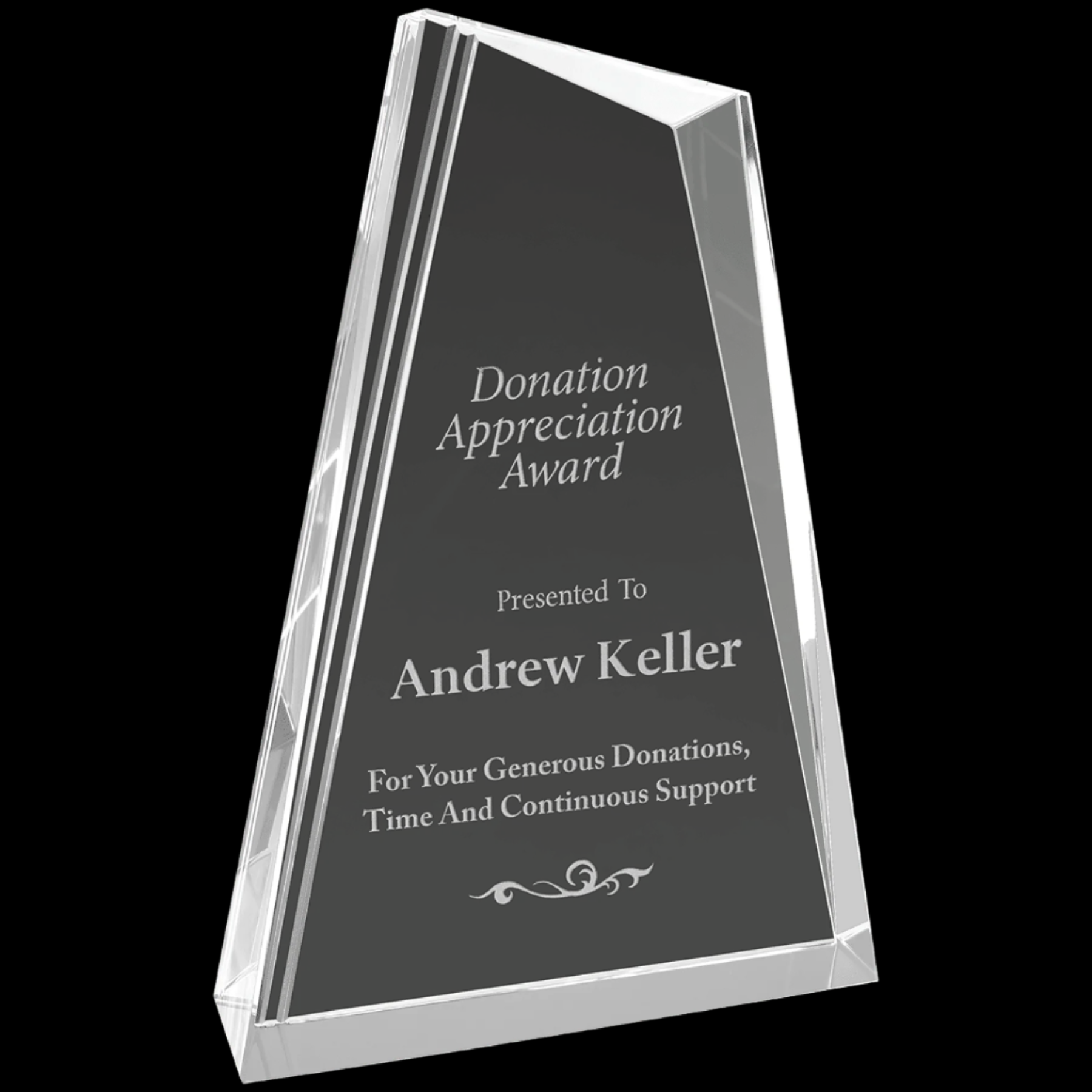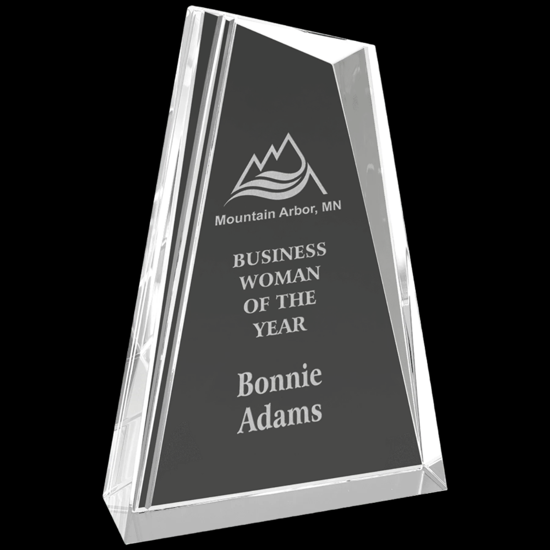 Our Crystal Peak awards are meticulously handmade, ensuring each piece is unique with slight size variations. Crafted from optic crystal, the peak features elegant decorative lines and a beveled edge, allowing it to stand independently or be mounted on a base. Each award is presented in a lined gift box, making it an exceptional choice for distinguished recognition.