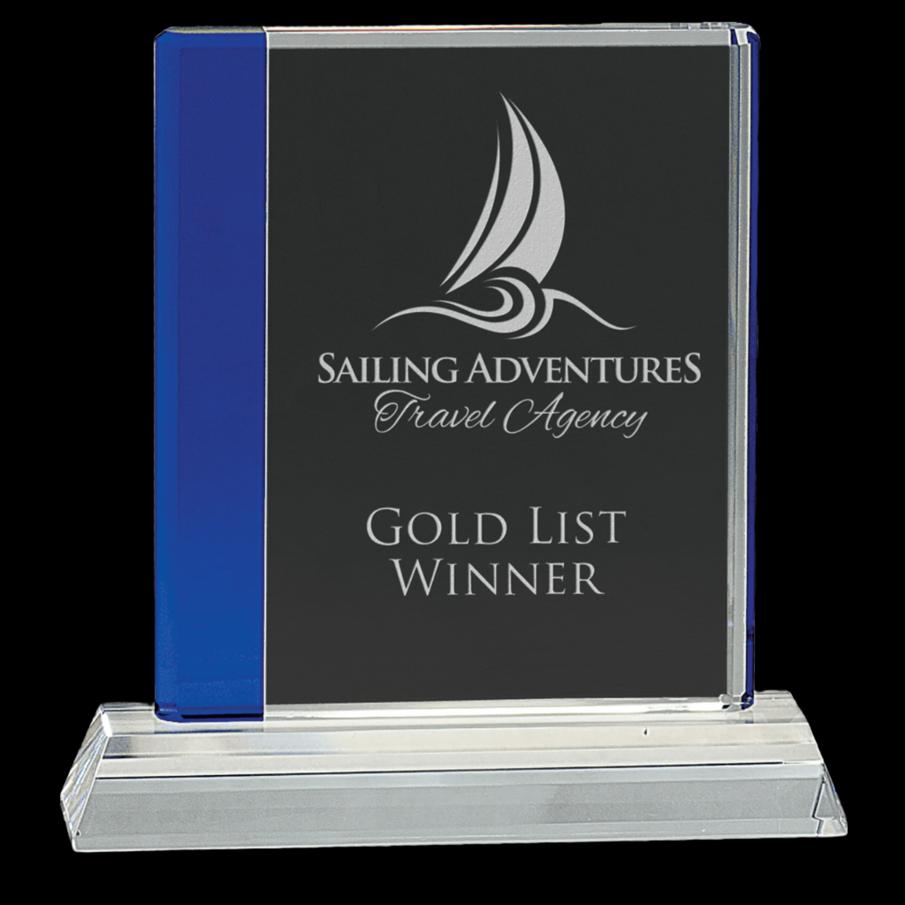 Our 7.25" Blue Edge Crystal Award features a clear optic crystal rectangle with a striking blue edge, elegantly mounted on a clear base. Each piece is handmade, ensuring slight size variations that add to its unique character. Designed double-sided, it offers versatile personalization options. Delivered in a lined gift box, this award combines craftsmanship with presentation, making it an exceptional choice for recognizing achievement.