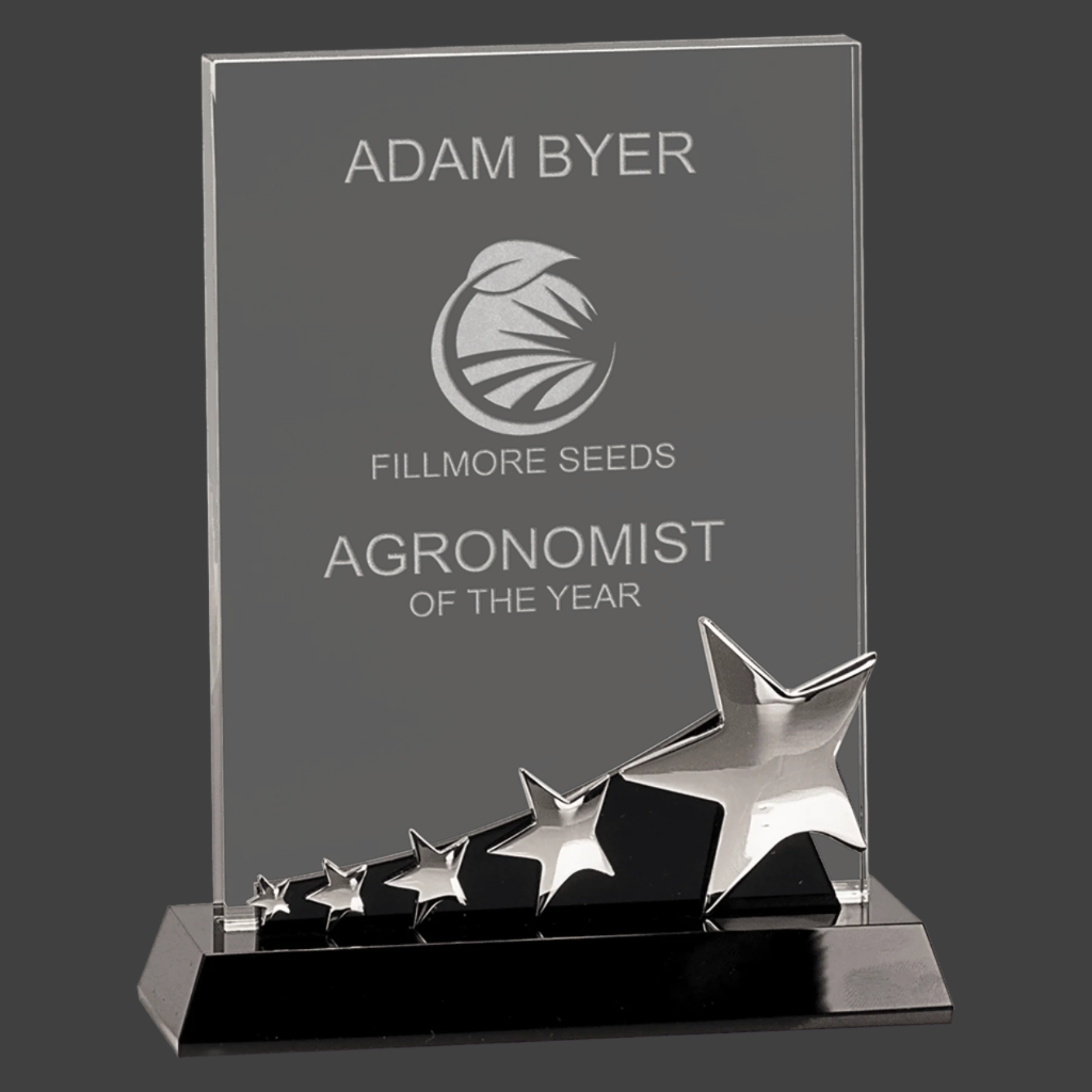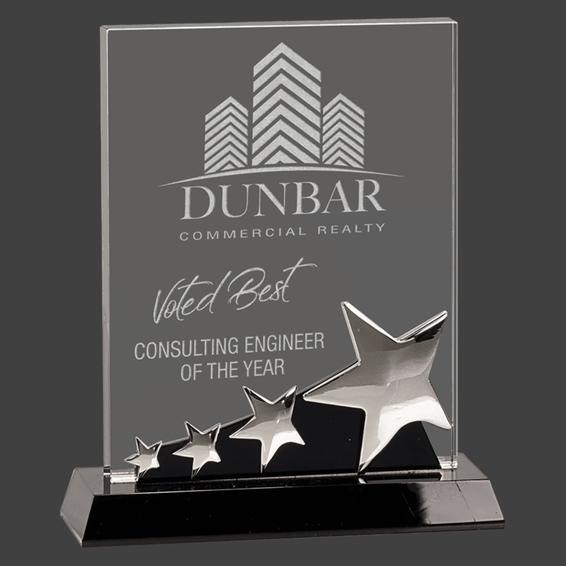 Rectangle Crystal with Silver Stars On Black Pedestal Base