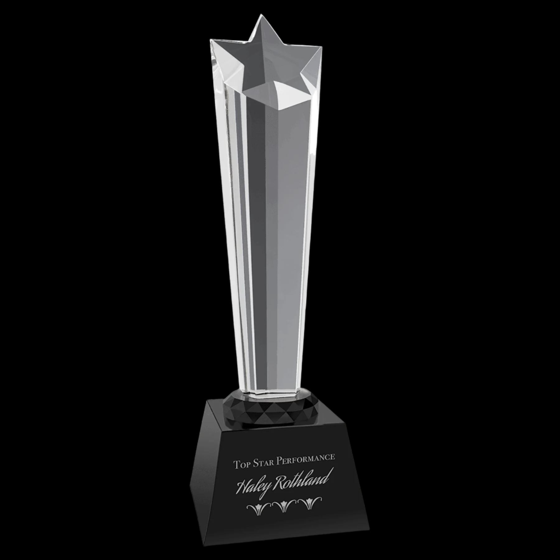 Our Crystal Rising Star with Black Base features a handcrafted optic crystal star that radiates from a sleek black circle riser. Each award is uniquely sized due to its handmade nature, ensuring a distinctive presentation. Mounted on a polished black crystal base, this elegant piece arrives in a lined gift box, making it an ideal recognition award with a refined, professional appeal.