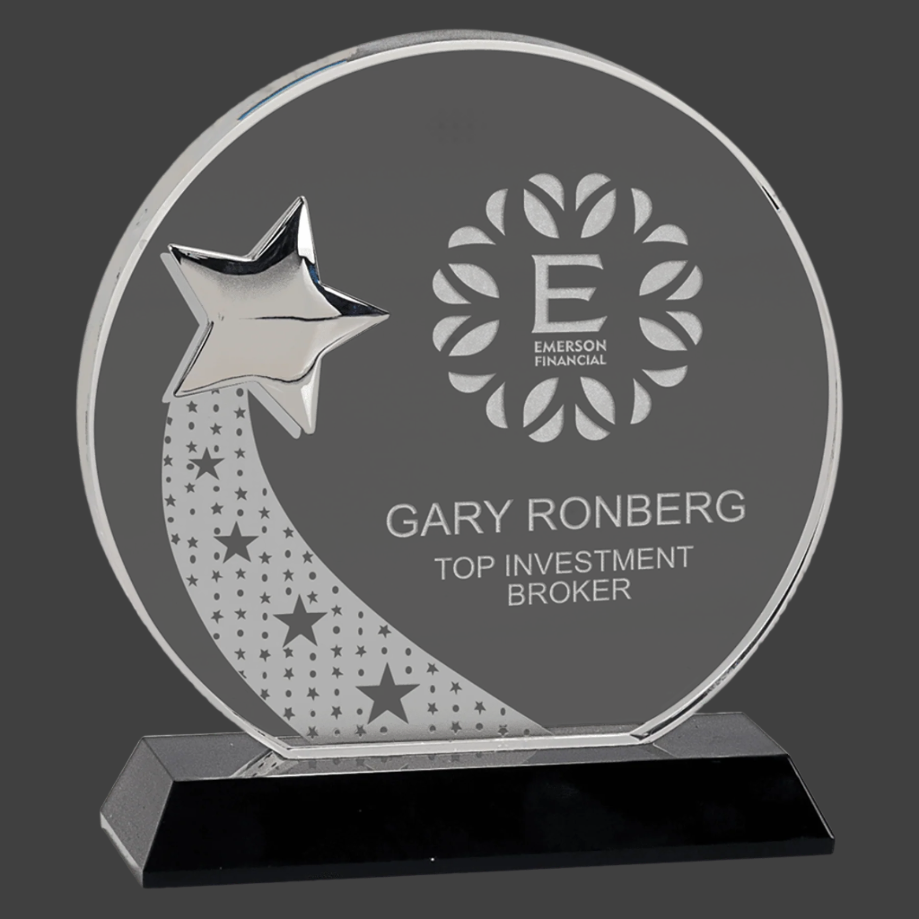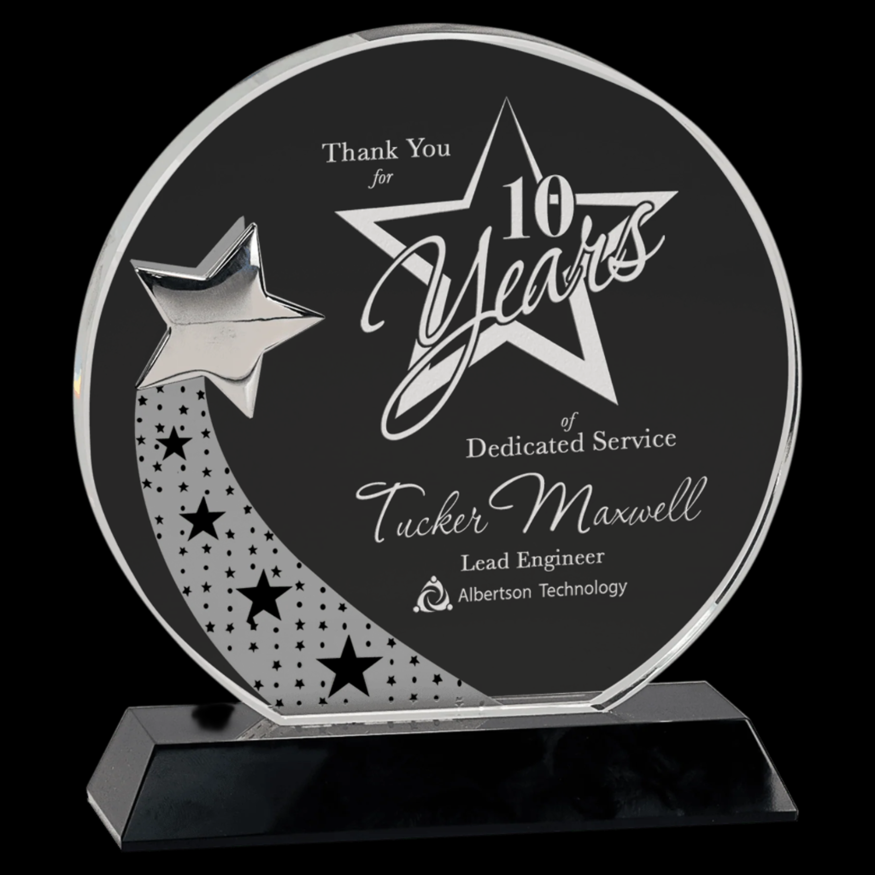 Our Round Crystal with Silver Star on Black Pedestal Base features a handcrafted clear optic crystal, each piece uniquely sized. Frosted shooting stars are delicately etched on the back, converging to a polished silver star on the front. Mounted on a sleek black crystal base, this elegant design is presented in a lined gift box, making it an exceptional choice for distinguished awards or commemorative displays.