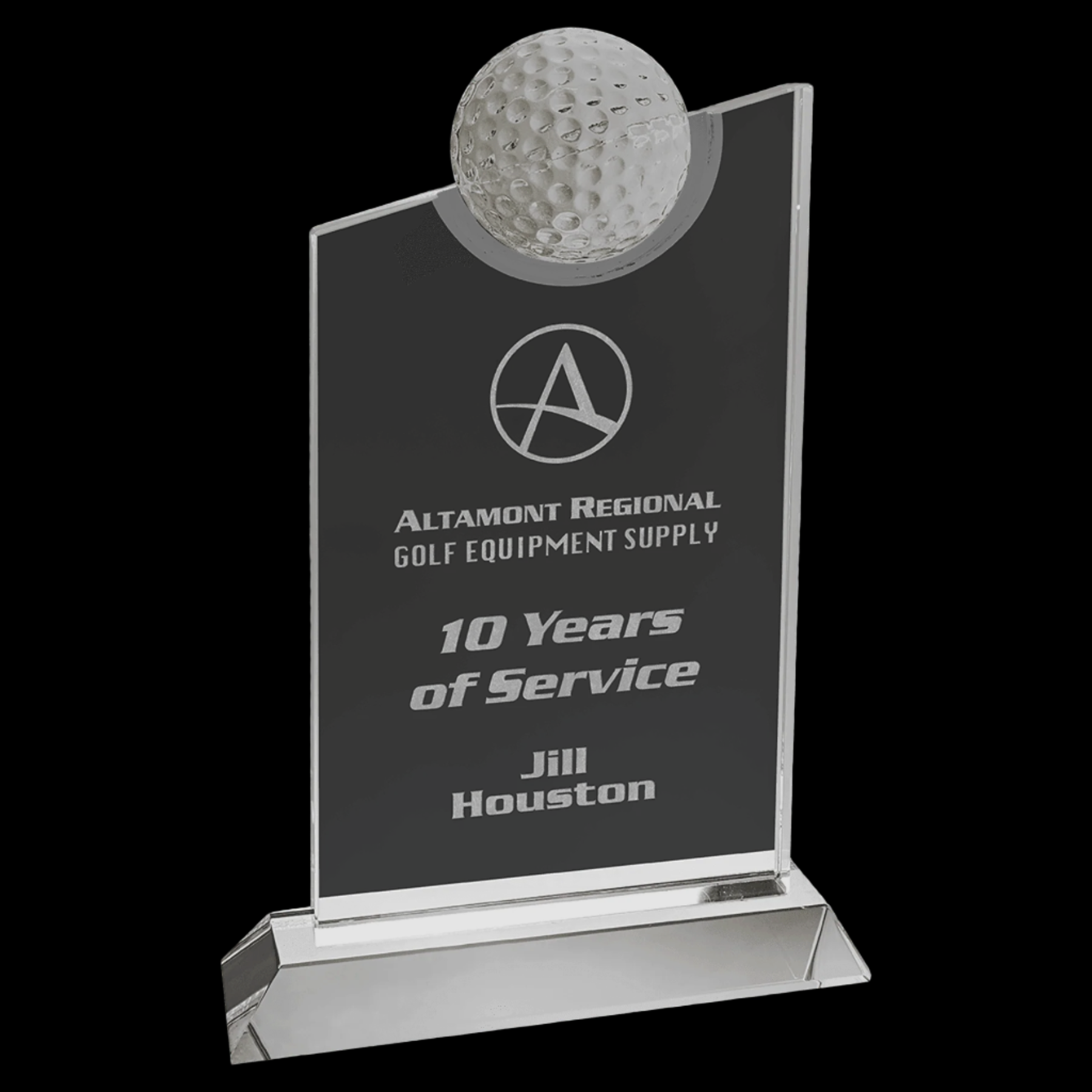 This Crystal Slant Golf Tablet features a 4.75" wide tablet rising 7.25" from a clear crystal base to an 8.25" peak. Its slanted top showcases a 2.375" diameter golf ball, providing a distinctive focal point. With ample space for personalized engraving on both the tablet and base, it offers a sophisticated way to honor golf achievements. Presented in a lined box, this award combines elegance with expert craftsmanship, making it an ideal recognition piece for golf skill and excellence.