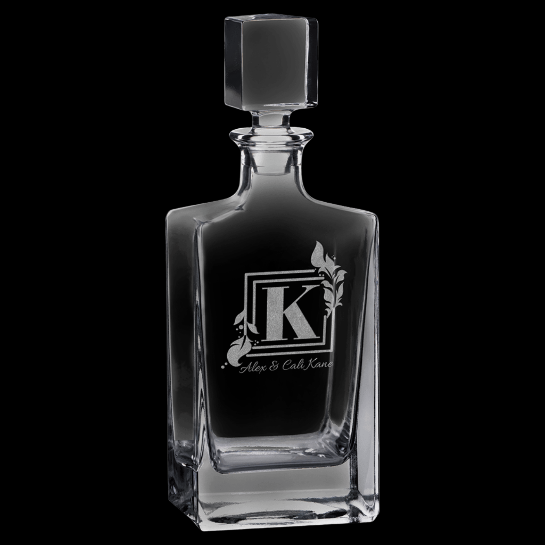 This refined rectangular glass decanter is equipped with a stopper lid that can be customized with a monogram, logo, or bespoke design. It is delivered in a robust black gift box, cushioned with dense EVA foam for optimal protection. An excellent choice for personalized promotional items, corporate awards, or commemorative event gifts.