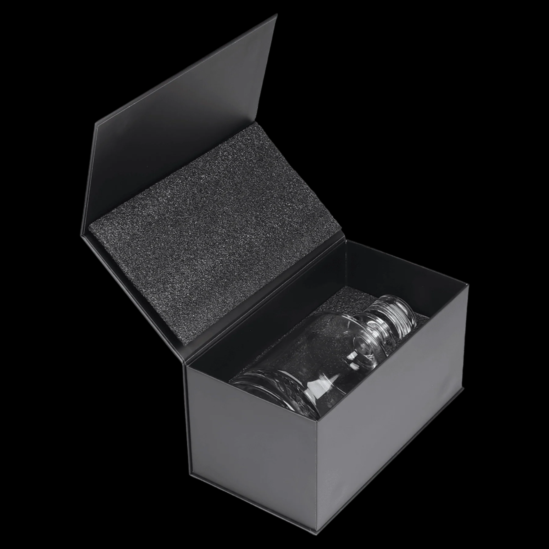 This 850mL round glass decanter combines elegance with personalization, featuring a customizable stopper lid for monograms, logos, or unique designs. Packaged in a sturdy gift box with thick EVA foam, it ensures secure protection during delivery. Perfect for corporate gifts or special events, this decanter offers a refined and professional presentation that enhances any occasion.