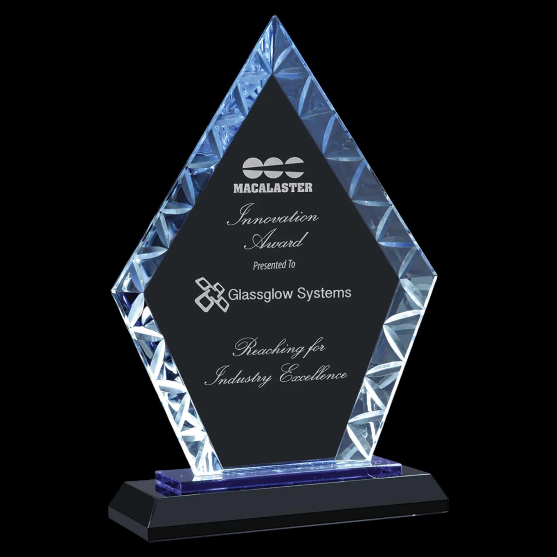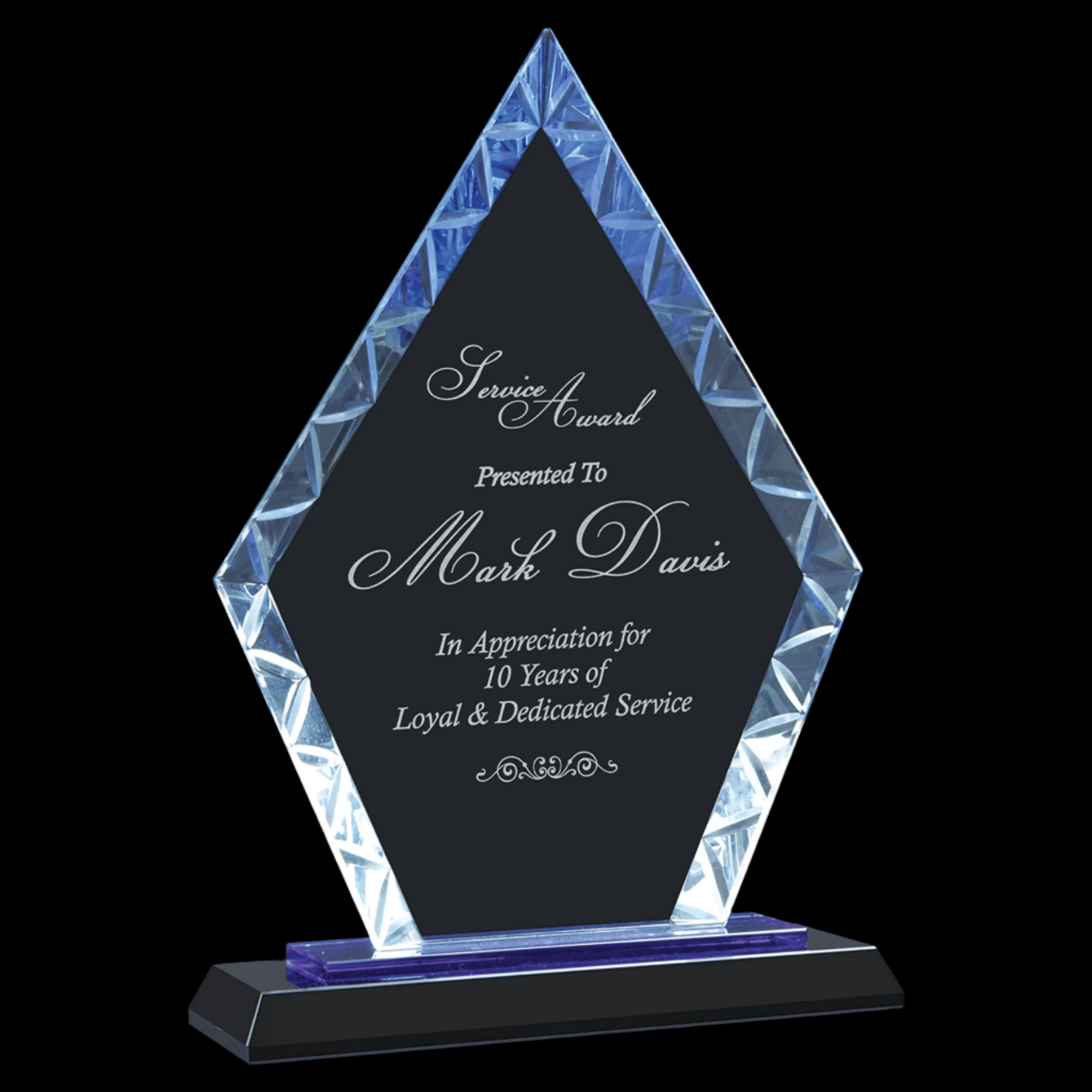 Diamond Shaped Accent Glass is expertly mounted on a sleek black glass base, combining elegance with durability. Crafted from .375" thick glass, this piece offers a substantial feel and lasting quality. Available in multiple sizes and colors, it provides versatile options to suit various design needs and settings. Ideal for adding a refined, modern touch to any space.